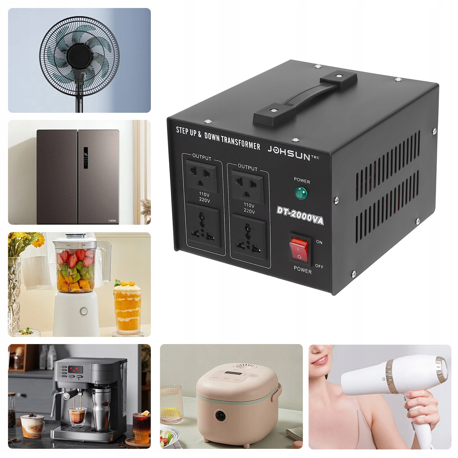 - Цей трансформатор може бути використаний для широкого спектру імпортних пристроїв, включаючи кондиціонери, холодильники, пральні машини, комп'ютери, телевізори, електричні вентилятори тощо