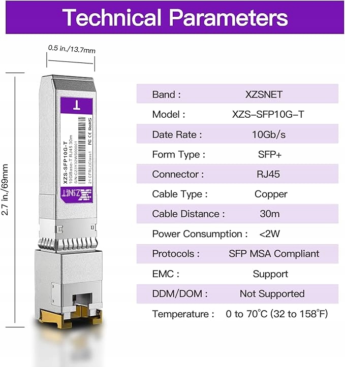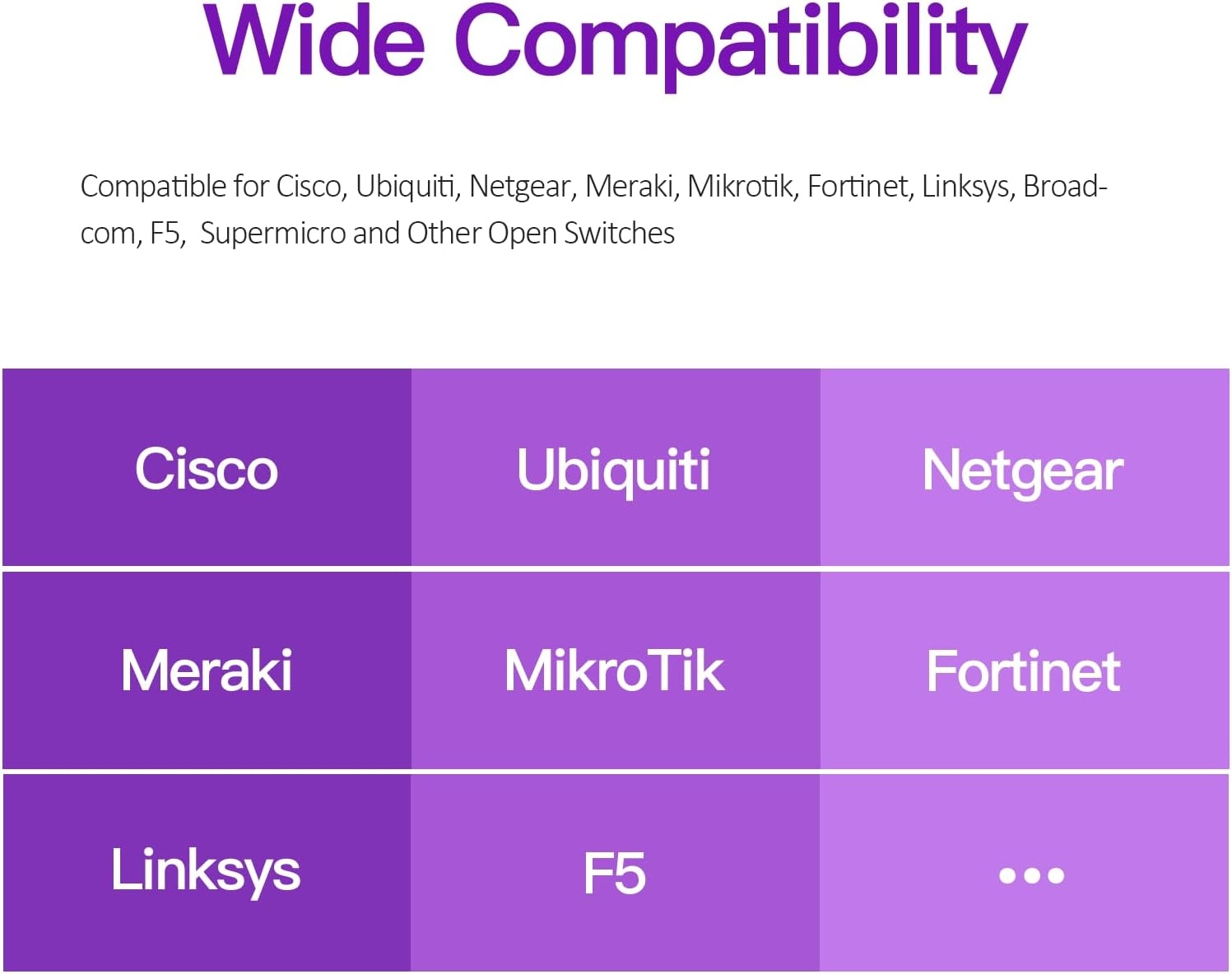 - Широка сумісність: сумісний із Cisco SFP-10G-T-S, Ubiquiti UniFi UF-RJ45-10G, Meraki MA-SFP-10GB-T, Mikrotik S+RJ10, Netgear AXM765, Broadcom, Supermicro, D-Link та іншими відкритими передавачами/комутаторами SFP (ПРИМІТКА: несумісний із комутаторами HP/HPE).