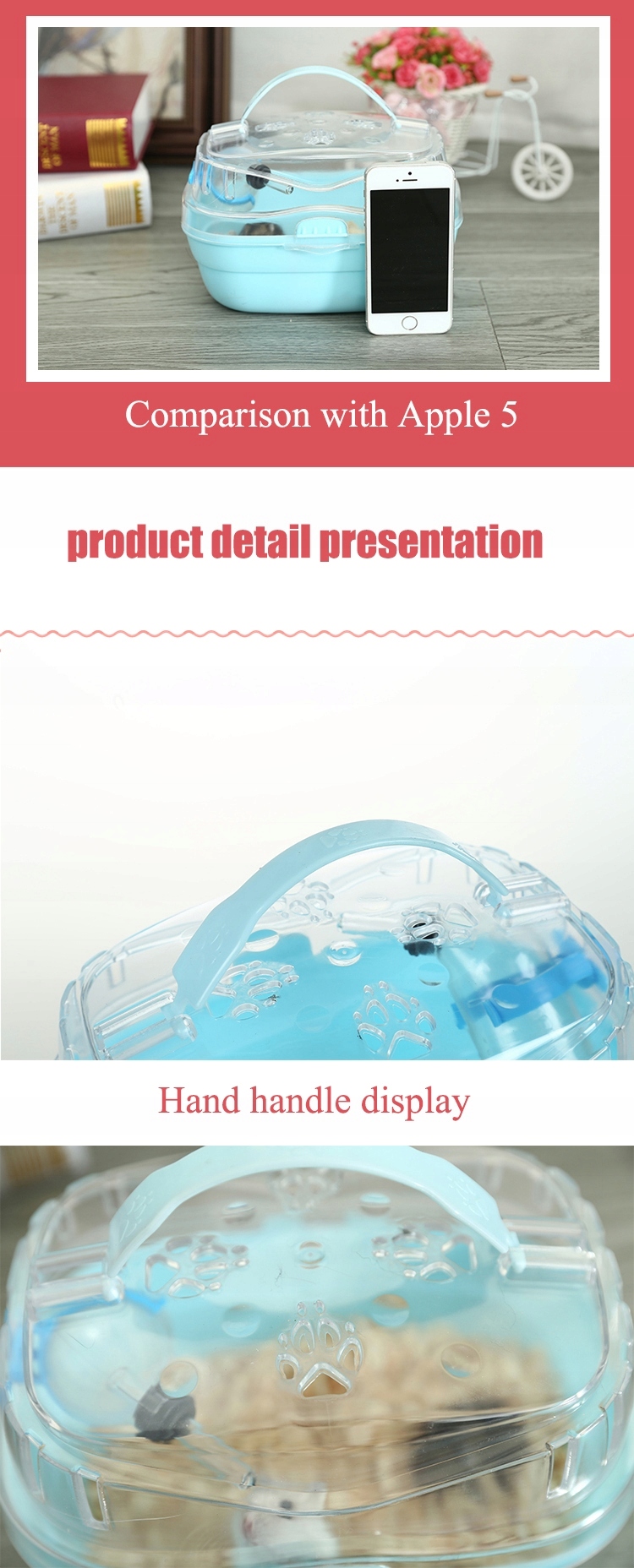 Опис дитини: Ремінька коробка дуже зручна і недорога! Підходить для великої відстані транспорту. Досить достатньо, легко перенести, може бути ремінцем руки або плечей, верхнім вікном вентиляції клітки, замком пряжки, щоб забезпечити безпеку, допоміжна плита, кульовий фонтан абсолютно підходить для одного годування, щоб покращити подорож до тривалого часу, дуже комфортно!