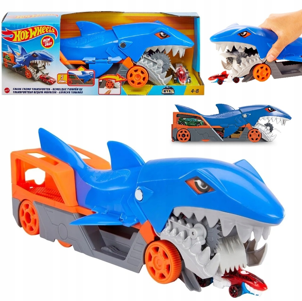 Багатофункціональна вантажівка, яка вміщує п’ять транспортних засобів і поставляється з одним автомобілем Hot Wheels® у масштабі 1:64 (інші автомобілі продаються окремо). Дітям від чотирьох років припаде до душі прибирання, «ковтаючи» транспорт! Ви також можете поєднати Акулу з іншими наборами Hot Wheels City і створити унікальне гоночне місто, повне небезпек і пригод!