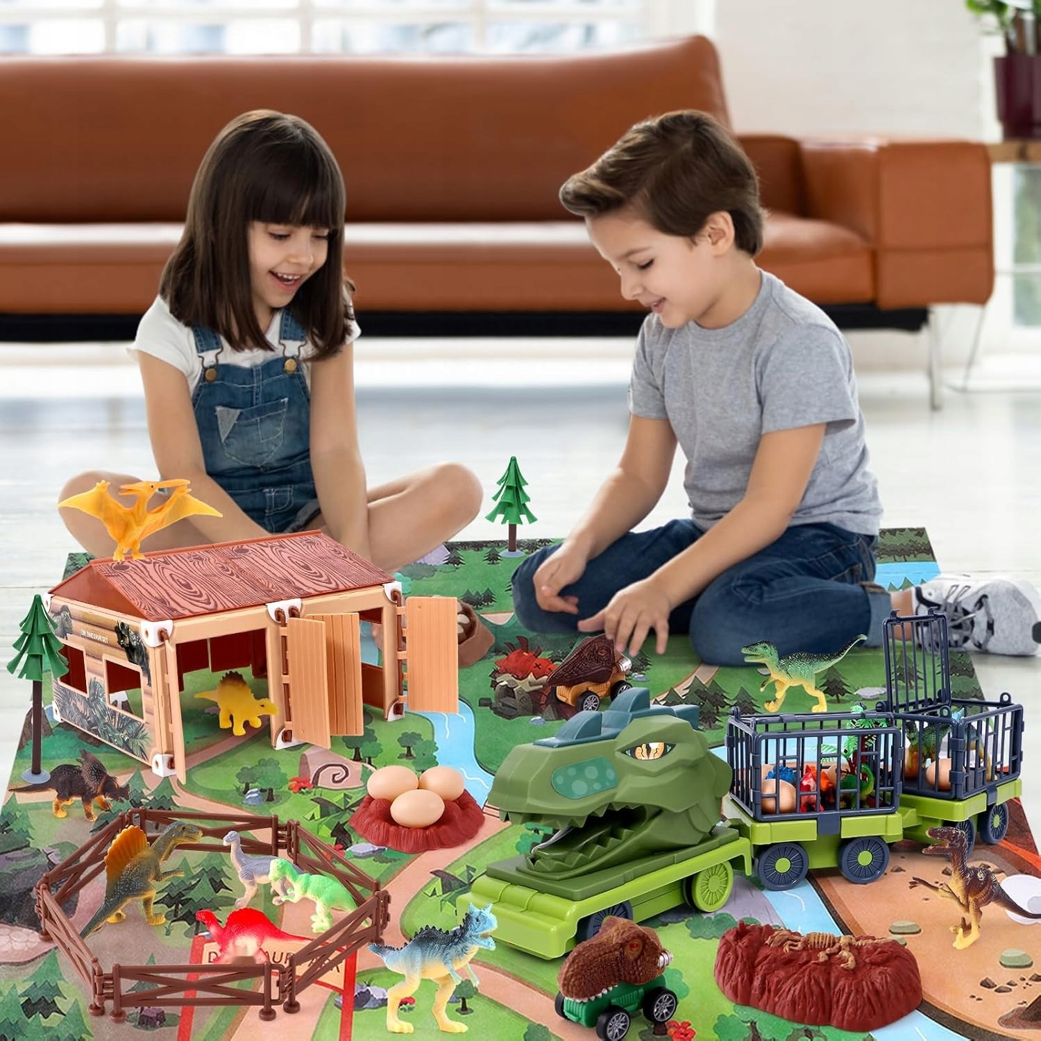 ✅ 【Набір іграшок з динозаврами】 Наш набір вантажівок для динозаврів містить 1 транспортну вантажівку, 2 автомобілі динозаврів, 1 матовий матч для гри, 22 статуетки динозаврів, 2 дерева, 6 яєць динозавра, 1 яєчний гніздо, 2 скельні сади та 1 набір домашніх аксесуарів ".