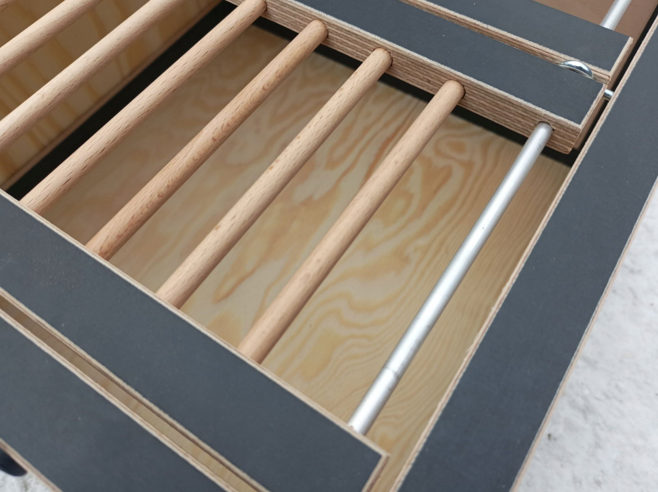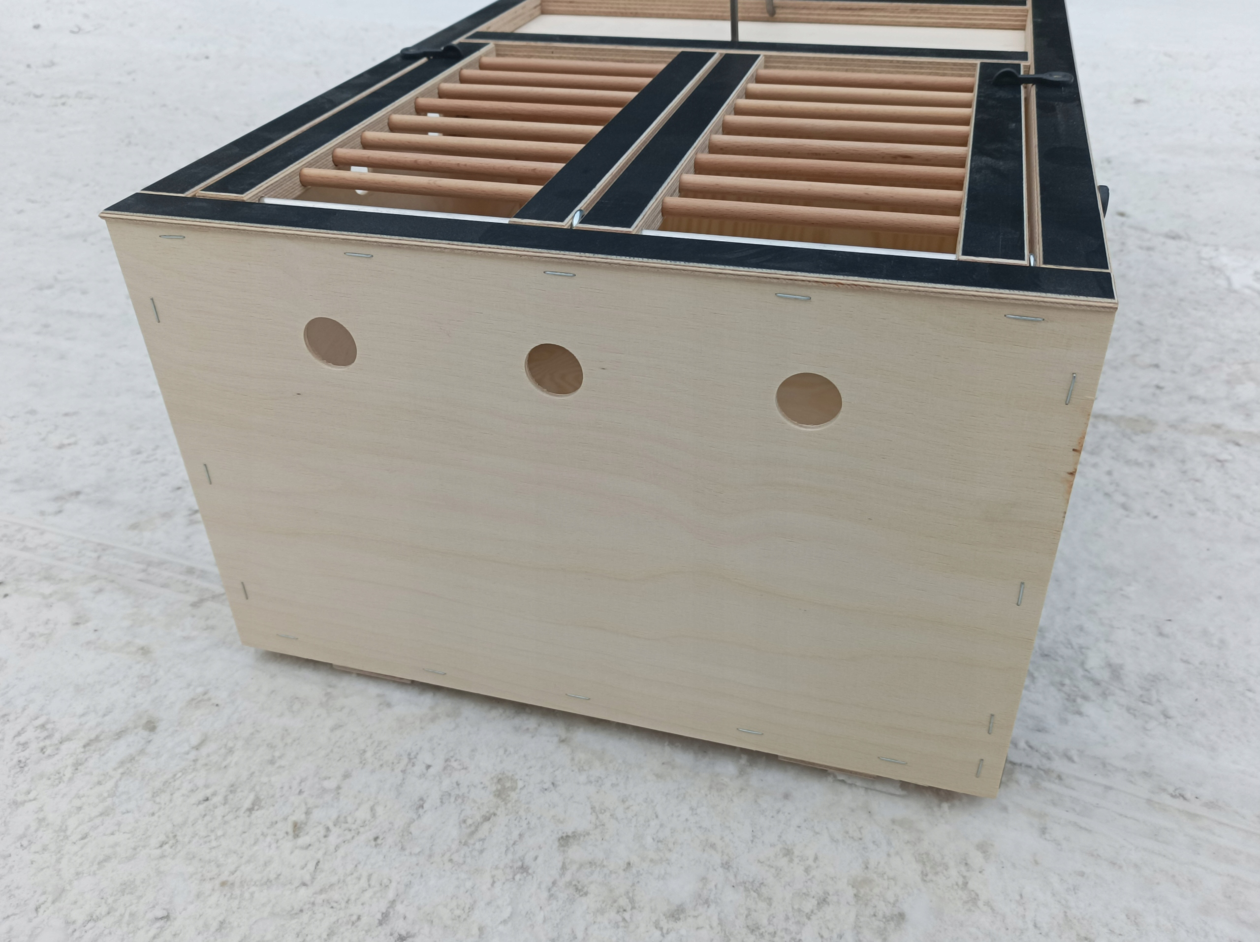 - Міцна конструкція з міцної фанери, з’єднана скобами для більшої міцності