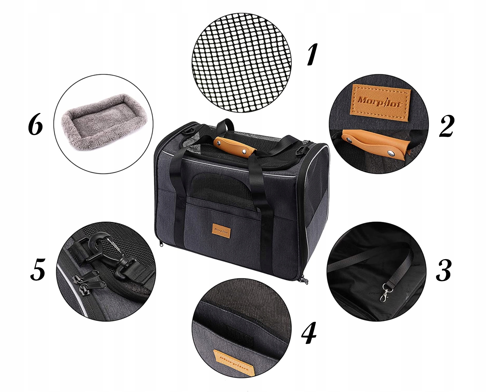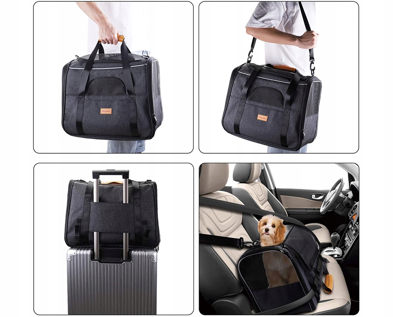 Для забезпечення безпечного транспортування транспортер оснащений 2 з’єднаними ручками для транспортування тварини та утримання рівноваги. Включає регульований плечовий реміньдля носіння без рук. Його можна скласти та розмістити під сидіннями літака. Таким чином ви завжди можете взяти свого улюбленця з собою, не подорожуючи окремо. Сумка для домашніх тварин має три бічні отвори, щоб ваша тварина могла легко увійти. Міцна блискавка забезпечує щільне закриття під час транспортування. Вентиляційні панелі з дихаючої сіткою в трьох напрямках не тількизабезпечують достатній потік повітря, але й дозволяють тварині дивитися назовні.