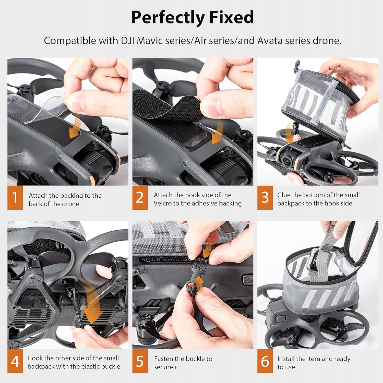 ідеально відремонтований. Завдяки використанню двох методів кріплення - пружинні стрічки та липучки - серія Mavic та Air підходить для кріплення пружиною стрічкою, серія Avata підходить для кріплення липучки, з смугами суворо прикріплені. Конструкція весняної стрічки не викликає ризику потрясінь, переміщення чи відшарування, а також не впливає на функцію уникнення перешкод. Весь складання не впливає на польоти