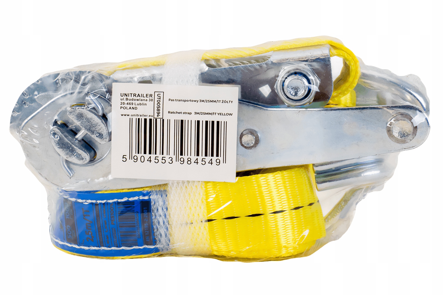 Транспортний ремінь з натягувачем Unitrailer у жовтому кольорі складається з двох частин: коротший з натягувачем (тобто храпочкою) і гачком, а довше з стрічкою також закінчується гачком. Загальна довжина ременя, включаючи стрічку та пряжку, становить 3 метри, що забезпечує відповідну довжину для різних транспортних застосувань. Ширина 25 -мм стрічки забезпечує оптимальну поверхню тиску. Ремінь характеризується тонізуванням 1 тонни (1000 дан), що дозволяє безпечним кріпленням та стабільним захистом навантаження під час транспортування.