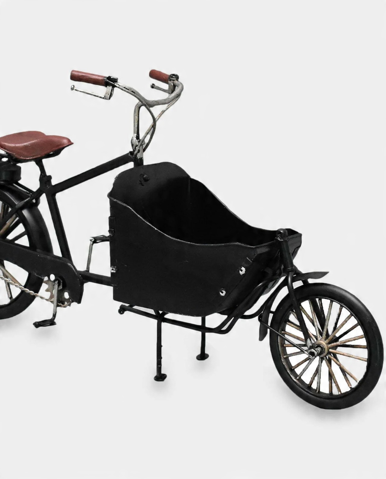 модель старовинного стилю, що зображує чорний транспортний велосипед з великим переднім кошиком, виготовленим з металу дуже точно, з увагою до найменших деталей. Модель справляє чудове естетичне враження і має позачасовий стиль. Підходить для багатьох інтер'єрів, як прикраса або як цікава ідея подарунка. Розміри: