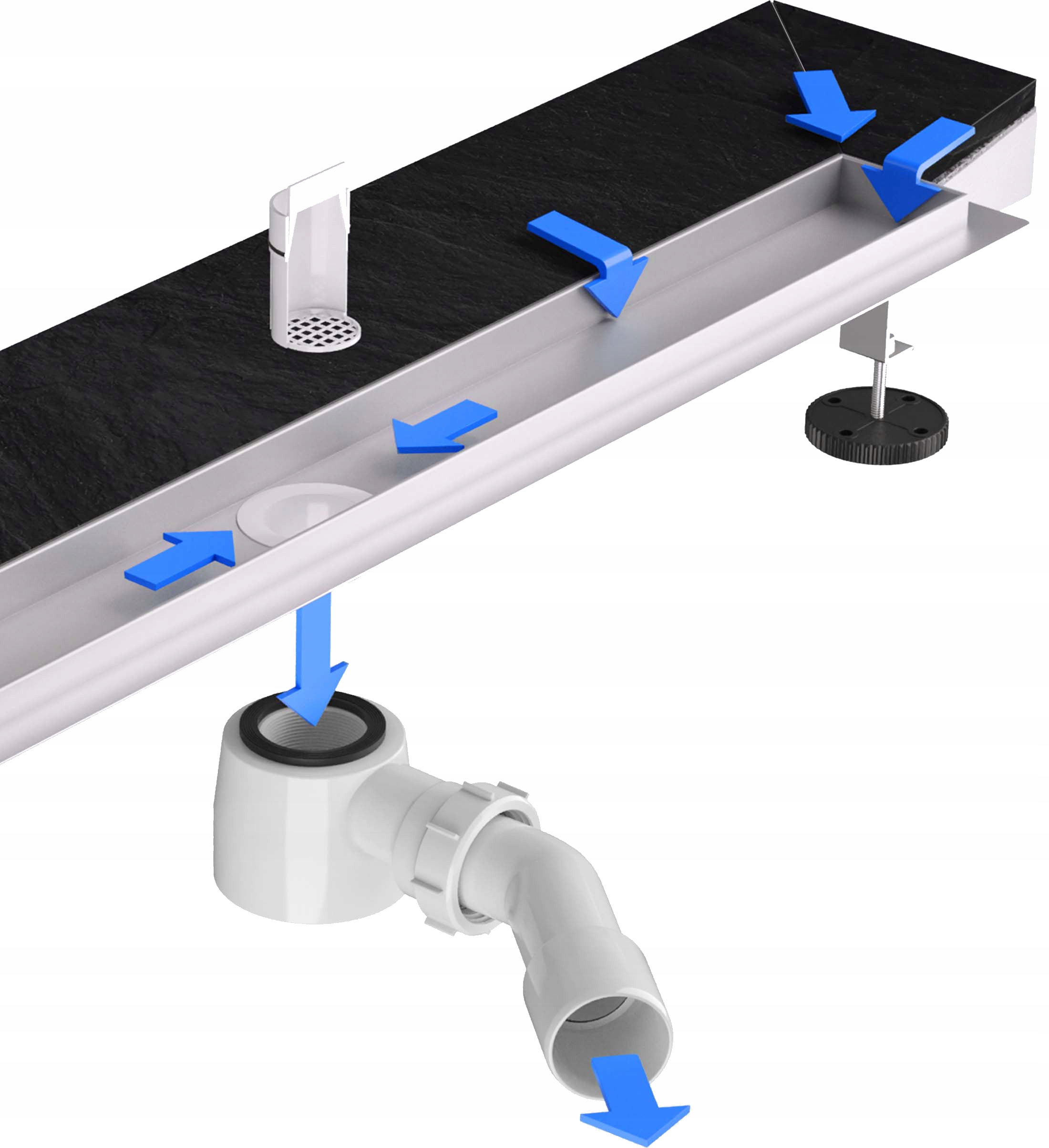 Лінійний злив підходить для плитки різної товщини. Завдяки самоклеючій бутиловій герметизуючій стрічці, що входить в комплект, злив повністю водонепроникний. Його встановлення відбувається швидко та ефективно.