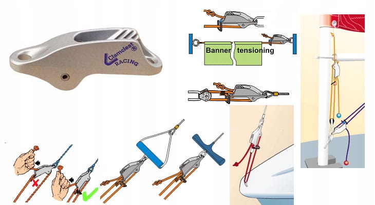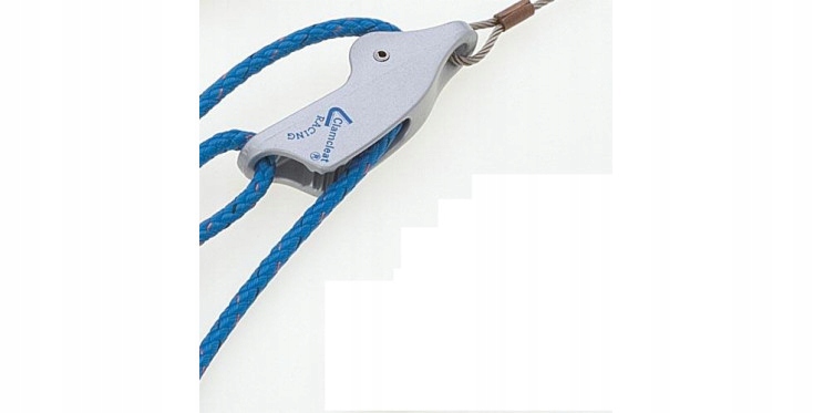 Трапецієподібний зажим, виробництва відомого виробника аксесуарів Clamcleat® Для мотузки діаметром від 4 до 8 мм. Виготовлений з алюмінію. Вбудований ролик дозволяє легко переміщати мотузку. Ланка, що входить у комплект, полегшує звільнення мотузки.