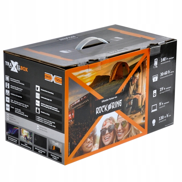 TRAVELBOX оснащено потужною літій-іонною батареєю на 150 000 мАг і багатьма різними розетками розетки для живлення звичайного обладнання, завдяки чому його можна використовувати як надійний накопичувач енергії, ідеальний для фестивалів, кемпінгу, поїздок на присадибну ділянку чи кемпінгу, поїздок на автомобілі або як джерело аварійного живлення.