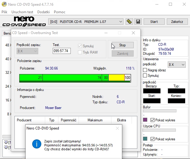 БУДЬ ЛАСКА, ПЕРЕД ПОКУПКОЮ ДІЗНАЙТЕСЬ, ЯК ЗАПИСЮЮТЬСЯ CDR 800MB \ 870MB \ 900MB CDS, тобто. лише в режимі Overburning і лише в режимі Dissc-At-Once (DAO). Крім того, не всі рекордери та програми для запису підтримують перезапис дисків CDR розміром 800 МБ\870МБ\900 МБ, тому перевірте це перед покупкою. ТАКОЖ БІЛЬШІСТЬ ПРИСТРОЇВ ЗАПИСУ ТА ПРОГРАМ ЗАПИСУ НЕПРАВИЛЬНО ВИЗНАЧАЮТЬ 800 МБ \ 870 МБ \ 900 МБ CDR ДИСКОВИЙ НОСІЙ як звичайний 700 МБ CD-R, але, звісно, у режимі перезапису вся ємність носія записується правильно. Якщо у вас є будь-які сумніви, чи підтримує ваш рекордер такі диски або він виявляє їх неправильно, виконайте тест симуляції в Nero Speed Disc - Overburning Test - після тесту диск, звичайно, чистий і готовий до запису. Приклади перевірки екрана з перезаписом можна знайти в галереї оголошень ...
