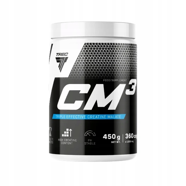 CM3 – це дієтична добавка від торгової марки Trec, що містить креатин малат у формі невеликих, зручних у використанні капсул. Відрізняється високою біодоступністю в організмі і стійкістю до кислого середовища травного тракту. Одним з основних властивостей креатину є підвищення працездатності та сили при виконанні коротких, але інтенсивних серій вправ. Він стимулює процес синтезу білка, надаючи прямий вплив на розвиток м'язової маси, а також має анаболічний ефект.