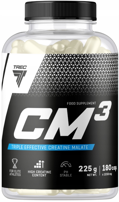 Trec CM3 - високоякісний креатин малат з чистим складом. Ви не знайдете в ньому жодних випадкових добавок чи запатентованих сумішей. Допомагає отримати максимально можливий в даний момент ефект у вигляді збільшення сухої м'язової тканини, а також підвищити загальну тренованість організму. Правильно використаний потенціал креатину допомагає підвищити фізичну працездатність, особливо у випадку послідовних коротких, дуже інтенсивних фізичних вправ. Малат більш стабільний, ніж моногідрат, що означає повільніше перетворення на неактивний креатинін у водному середовищі. Зрозуміло, порцію все одно слід приймати відразу після приготування (якщо ви використовуєте порошок). Він підійде для всіх фізично активних людей, незалежно від їхнього рівня розвитку та кількості циклів креатину.