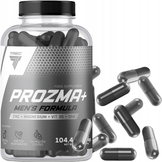 Trec PROZMA+ - це дієтична добавка у формі капсул, що містить D-аспарагінову кислоту (DAA), а також цинк, магній і вітамін B6.