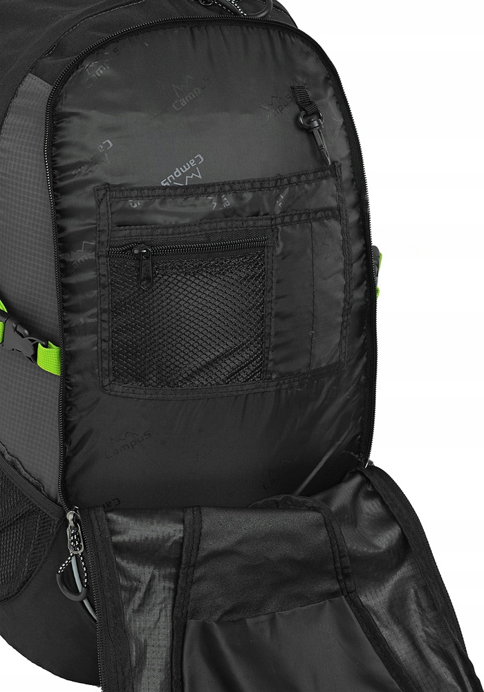 Брендований туристичний рюкзак від Campus. Модель «HORTON 30» - ідеальне рішення для коротких гірських походів, походів або як повсякденний рюкзак. Завдяки передовій системі перенесення AIR-FLOW на основі загнутої всередину рами в поєднанні з вентиляційною системою Air-Con і плечовими лямками анатомічної форми рюкзак дуже простий в носінні, зручний і ви не будете відчувати втоми навіть після тривалого перебування. похід. Дуже місткий - в нього можна помістити багато необхідних речей - має одне основне відділення з великим завантажувальним отвором, додаткове відділення з органайзером і кишеню в передній частині рюкзака. Солідно виготовлений, добре продуманий і закінчений - кожна деталь вишукана. Виготовлений з високоякісних матеріалів, таких як: поліестер 600D. Цей матеріал характеризується дуже високою стійкістю до стирання та розриву. Рюкзак має регульовану місткість за допомогою шнурків і ременів, внутрішнє відділення для резервуара для води, органайзер і дощовик.
