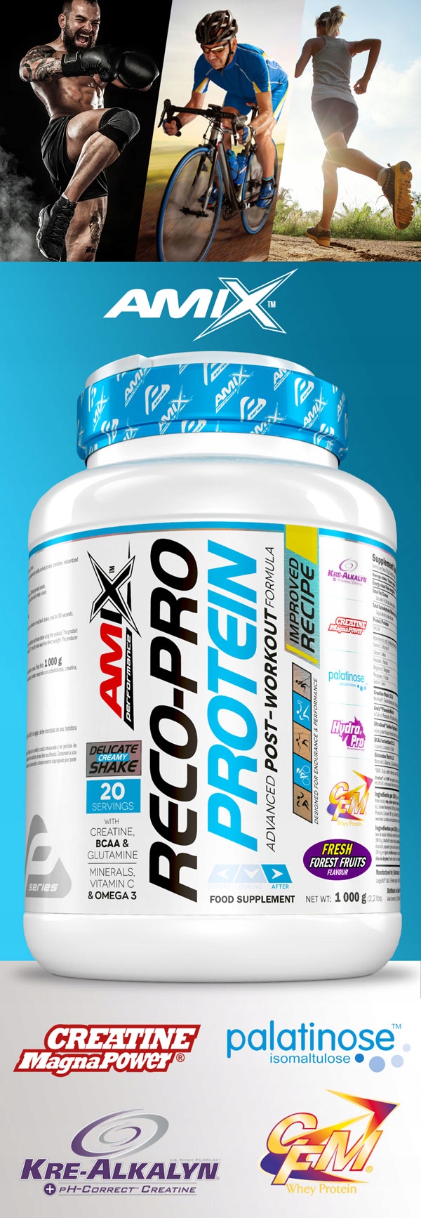 Високоякісний протеїновий комплекс на основі білкового ізоляту CFM®. Забезпечує максимальне живлення м'язів, скорочує період регенерації і виключає появу хворобливості після тренувань. Поєднання кількох джерел білка робить добавку добре збалансованою та ефективно виконує свою роль, адаптуючись до потреб різних спортсменів. Amix Reco-Pro Protein піклується про аспекти здоров’я імунної та травної систем – він містить білкові фракції, а саме – бета-лактоглобулін, альфа-лактоглобулін, сироватковий альбумін, імуноглобулін, гломомакропептид, лактоферин, лактопероксидаза), які покращують функціонування травну систему і благотворно впливають на травну систему імунну. Недоступно в більшості конкуруючих продуктів.