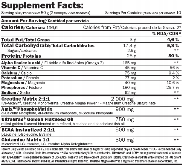 Інгредієнти для 50 г / 100 г (зі смаком шоколаду): концентрат сироваткового протеїну, ізолят сироваткового протеїну CFM® b>, ізолят яловичого білка, гідролізат сироваткового білка, амілопектин - воскоподібний кукурудзяний крохмаль (містить сліди SO2), мальтодекстрин, какао-порошок, Palatinose ® (ізомальтулоза), креатин з модифікованим PH (Kre-Alkalyn ® ) 1000 мг / 2000 мг, UltraGrad ® (суміш лляного насіння та риб'ячого жиру) 750 мг / 1500 мг, креатину моногідрат 500 мг / 1000 мг, Creatine Magna Power ™ (креатин, магнію бісгліцинат) 500 мг / 1000 мг, стабілізатор: гідролізат колагену; загусники: ксантан і гуарова камедь; двоосновний фосфат кальцію (кальцій, фосфор), двоосновний фосфат натрію (натрій, фосфор), L-лейцин 250 мг / 500 мг, L-глутамін 250 мг / 500 мг, L-глутаміну альфа-кетоглутарат 250 мг / 500 мг, гідроген калію фосфат (калій) фосфор), L-ізолейцин 125 мг / 250 мг L-валін 125 мг / 250 мг, емульгатор: соєвийлецитин; аромат, аскорбінова кислота (віт. С), підсолоджувачі: сукралоза та ацесульфам-К;