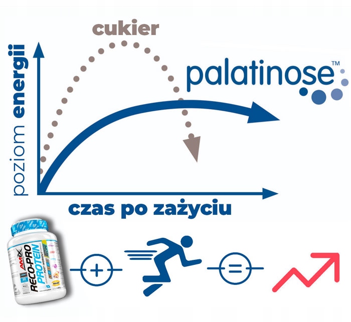 - Вміст електролітів впливає на баланс мінералів, пошкоджених під час тренувань. Він зволожує організм. ДобавкаPalatinose® (ізомальтулоза) – це джерело енергії з пролонгованим вивільненням. Завдяки низькому глікемічному індексу (ГІ 32) не викликає надмірного виділення інсуліну та глюкози в кров. Він чудово доповнює інші інгредієнти Reco-Protein, створюючи повноцінну регенеруючу суміш для бігунів, велосипедистів, плавців і всіх спортсменів, які займаються витривалістю.