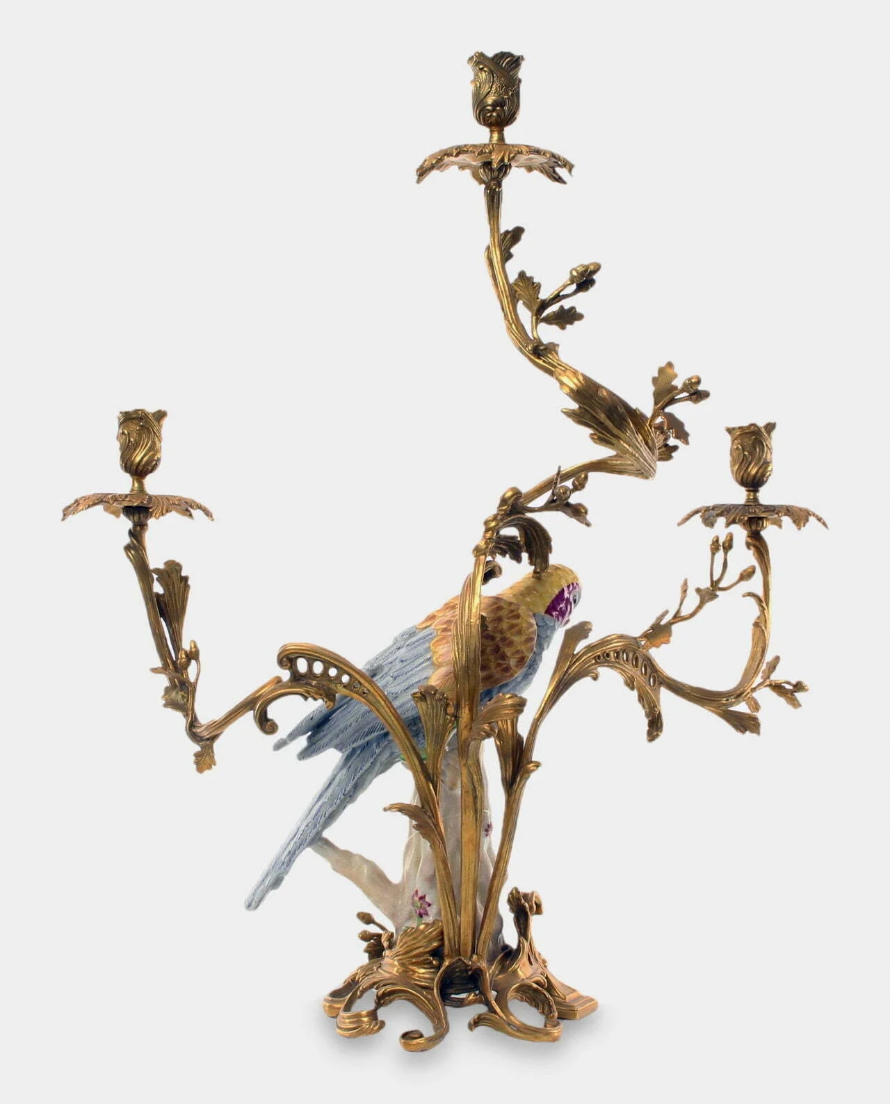 унікальний, великий канделаба -три -бронзе та порцеляна на 3 свічках. Прекрасно зроблено дуже точно, з увагою до найменших деталей. База з фігурою папуги, що сидить на багажнику, дивлячись ліворуч. Багатий оформлений і зафарбований в руку. У ньому багато прекрасних деталей. Це справляє величезне естетичне враження і має позачасовий стиль. Підходить для багатьох інтер'єрів, як прикраса весільних столів або вестибюля готелю.