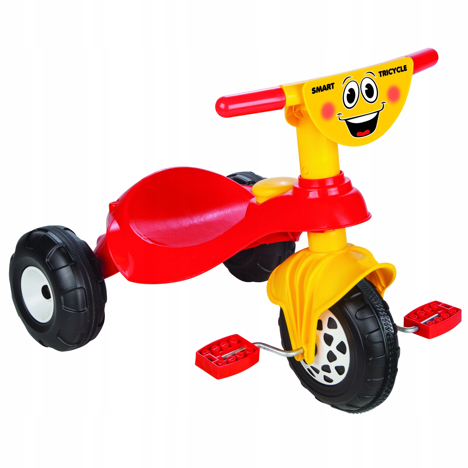 Розумний три -колесний велосипед з рогом. Підтримується педалями на передньому колесі, пластикові шини та зручне сідло. Червоним. Максимальна вантажопідйомність 35 кг.