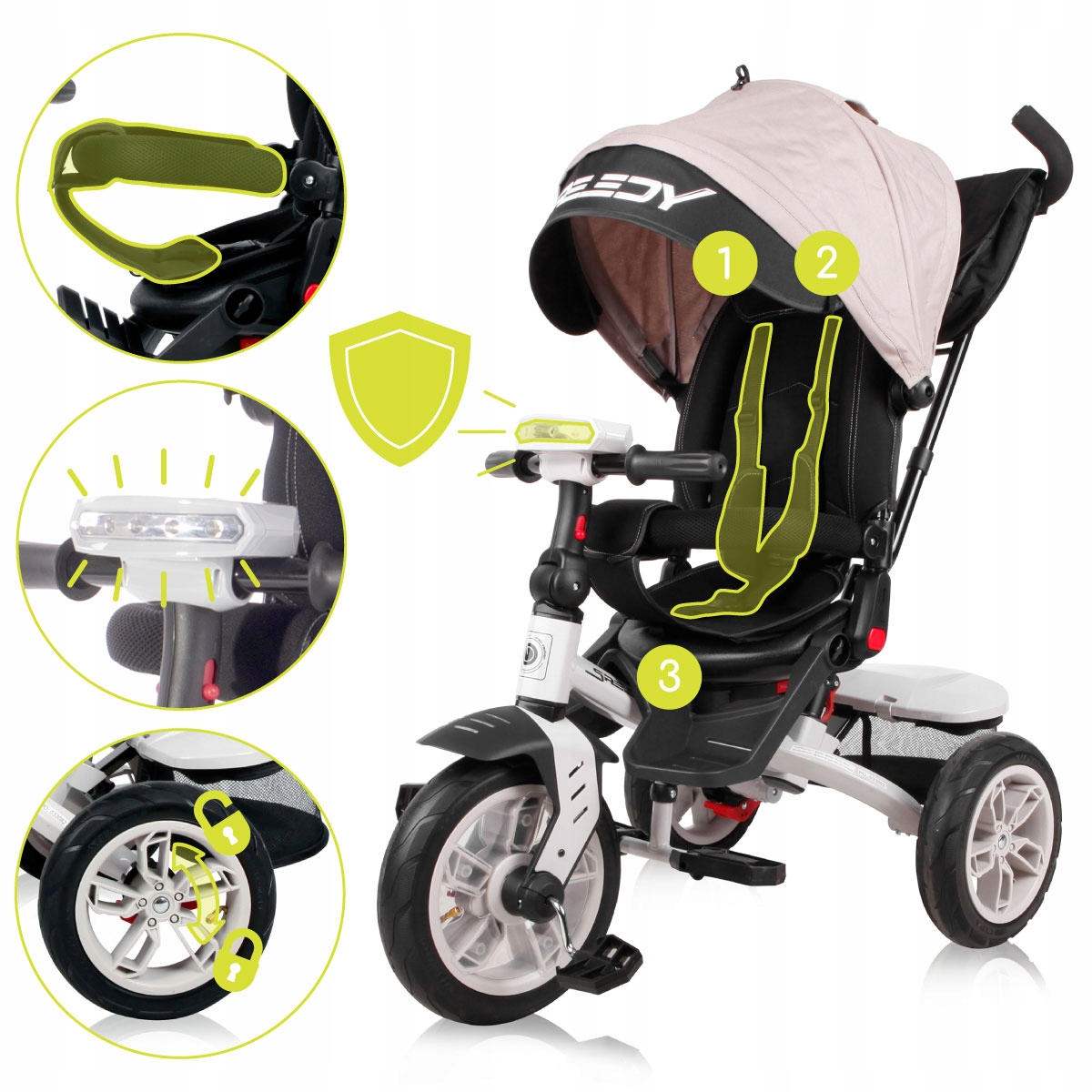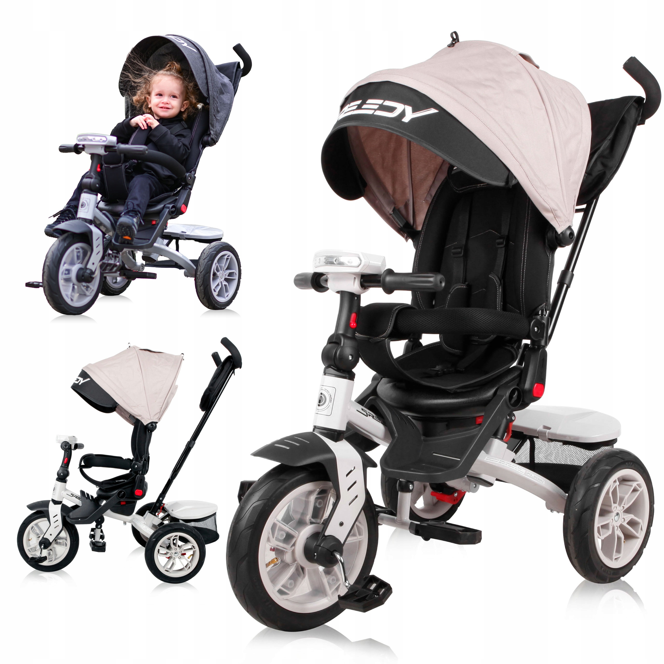 Lorelli Speedy Air -це універсальний трійкий велосипед, який адаптується до потреб вашої дитини з 12 місяців до приблизно 3 років. Завдяки можливостям конфігурації він виступає як коляска, і з часом стає незалежним велосипедом , підтримуючи розвиток двигуна малюка.