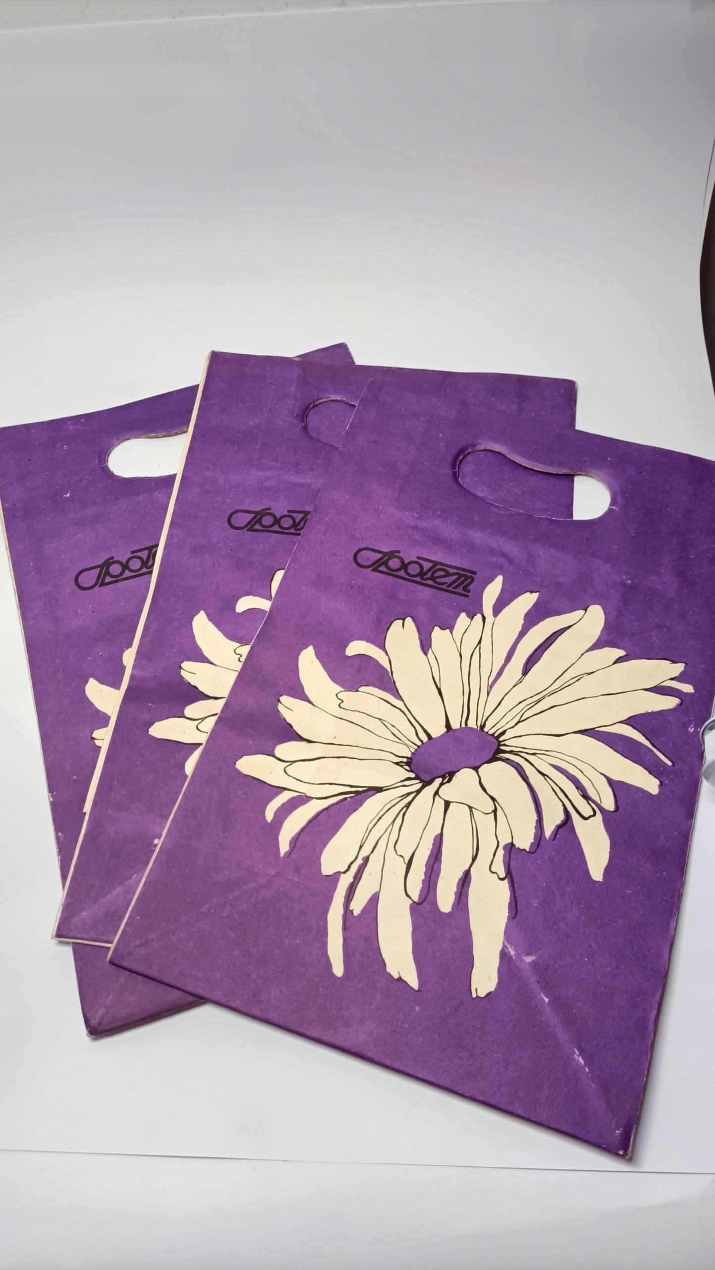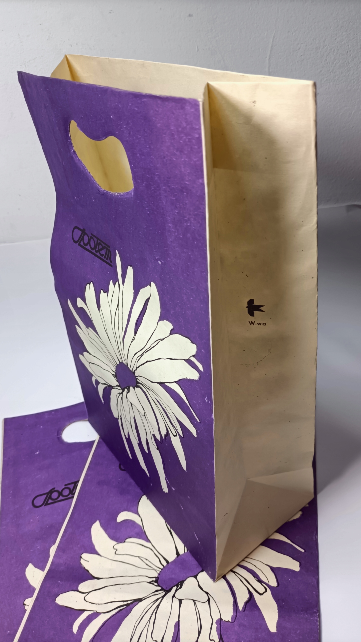Три паперові пакети споживчої кооперації Społem. Двостороння, з логотипом. Виготовлений з цупкого паперу сіруватого кольору, не лакований. З часів Польської Народної Республіки. Тодішній пік розкоші та престижу. На згадку про ті часи реквізит.