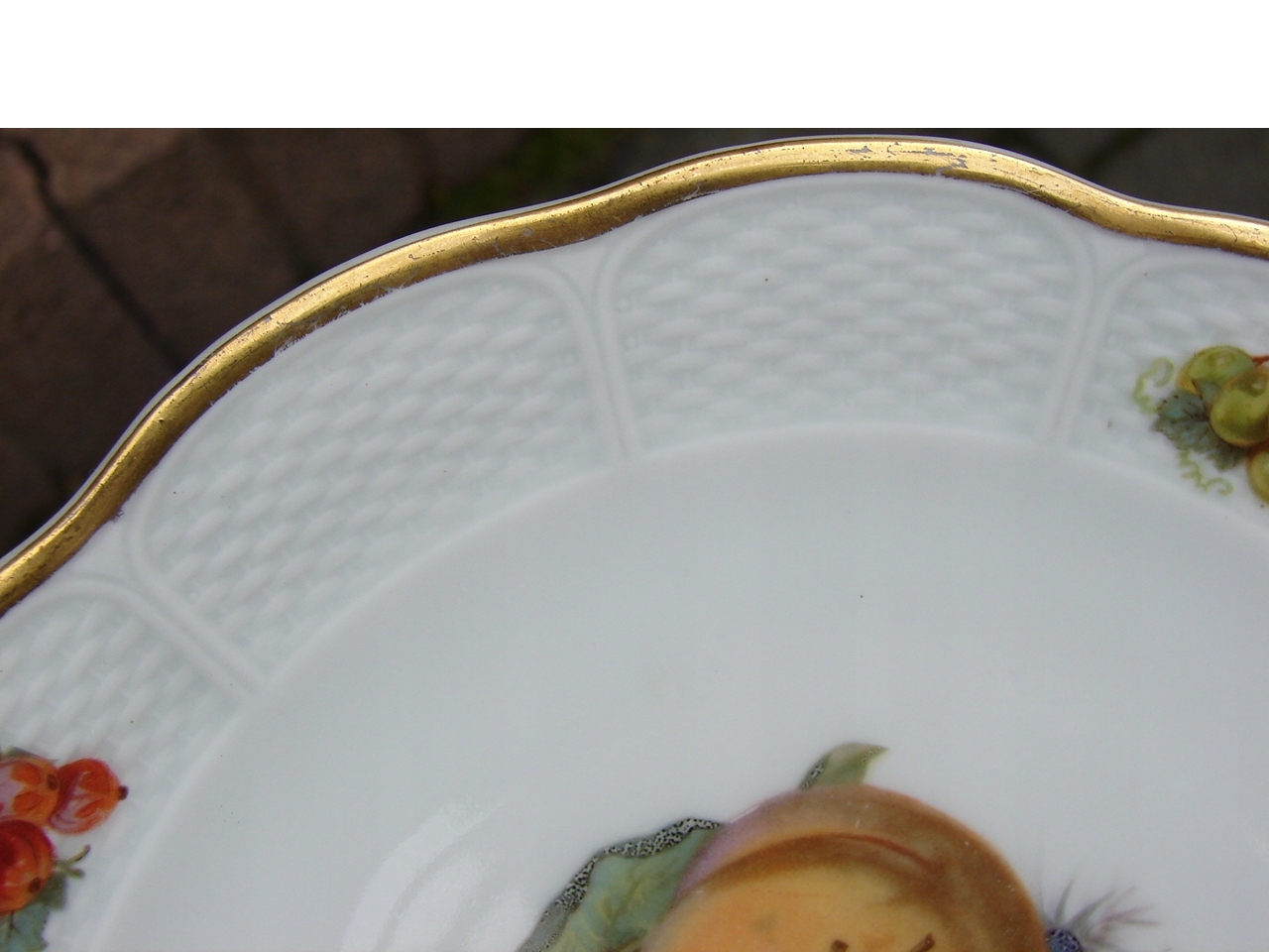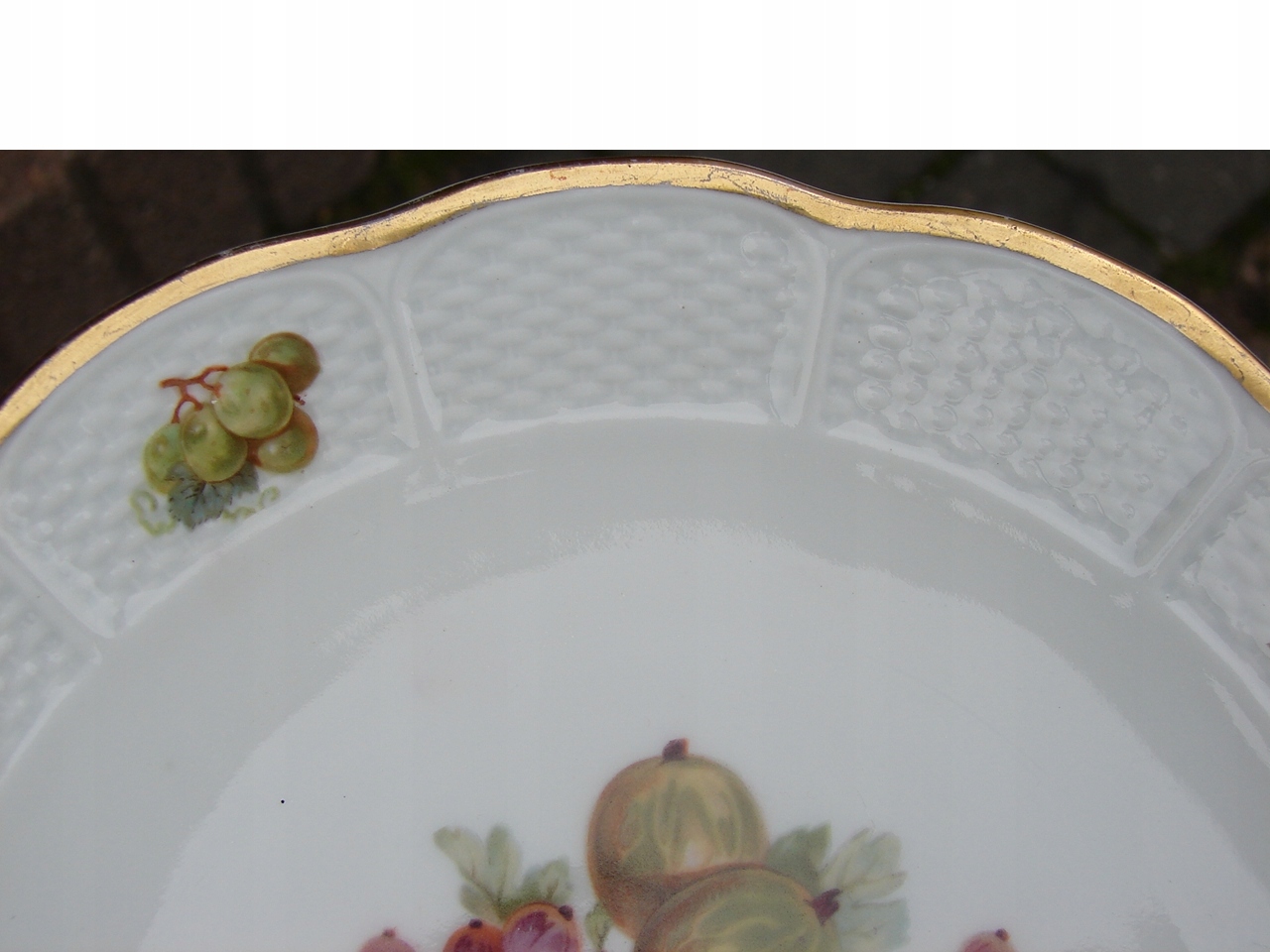 Набір із трьох старовинних порцелянових десертних тарілок, прикрашених рельєфним фруктовим мотивом, бортик оздоблений старим золотом.