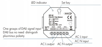 dt-c-це диммер фази Далі, призначений для регулювання яскравості тьмяних лампочок та світлодіодних ламп. Контроль Dimmer відбувається на автобусі Далі через майстра Далі. Діммер також працює із зовнішньою кнопкою Zelle, щоб виконати функцію вмикання / вимкнення освітлення та затемнення 0-100%. Адресу DALI можна призначити вручну та відображати на дисплеї або автоматично передавати через пристрій Superior Dali. Барабан у протилежній фазі або передній частині. Дані повного Діммера у доданій каталозі картки виробника. Висока якість.