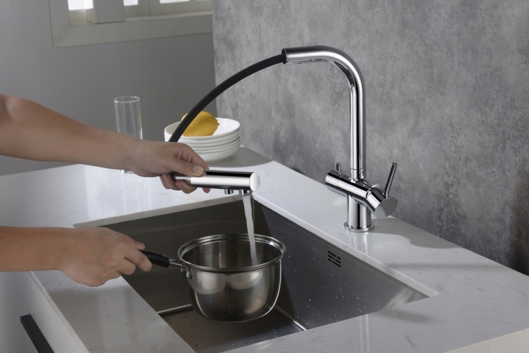 Кухонний триходовий змішувач для холодної, гарячої та фільтрованої води. У набір входить набір з’єднань (шланги, заглушки, прокладки), необхідних для правильного з’єднання.