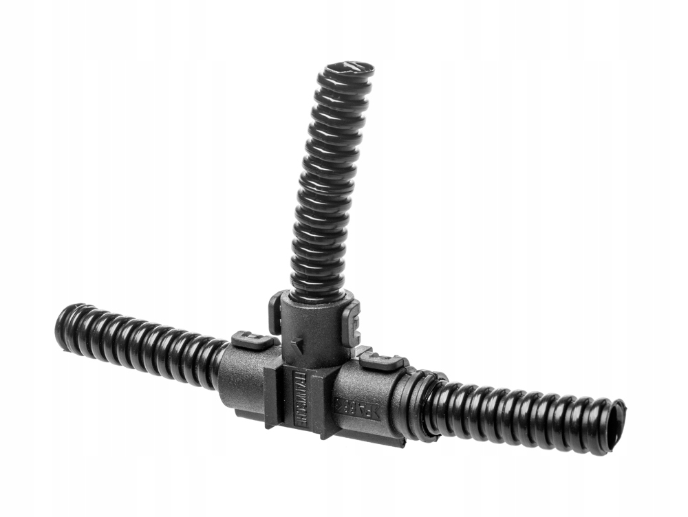 Пропозиція поширюється на 1 шт. Трійник для гофрованої труби, труба для електроустановок. Продукція Frankische – це гарантія найвищої якості. Трійники нероз'ємні, що відкриваються, типу Т 90º, дозволяють з'єднати три гофровані труби, трубопроводи. Трійники виготовлені зі спеціально модифікованого поліаміду, який є самозатухаючим, не містить галогенів і кадмію. Фіксація трубопроводу в трійнику здійснюється замиканням муфти з самофіксацією на гофрах труби, що забезпечує високу стійкість до вириву труби з муфти.
