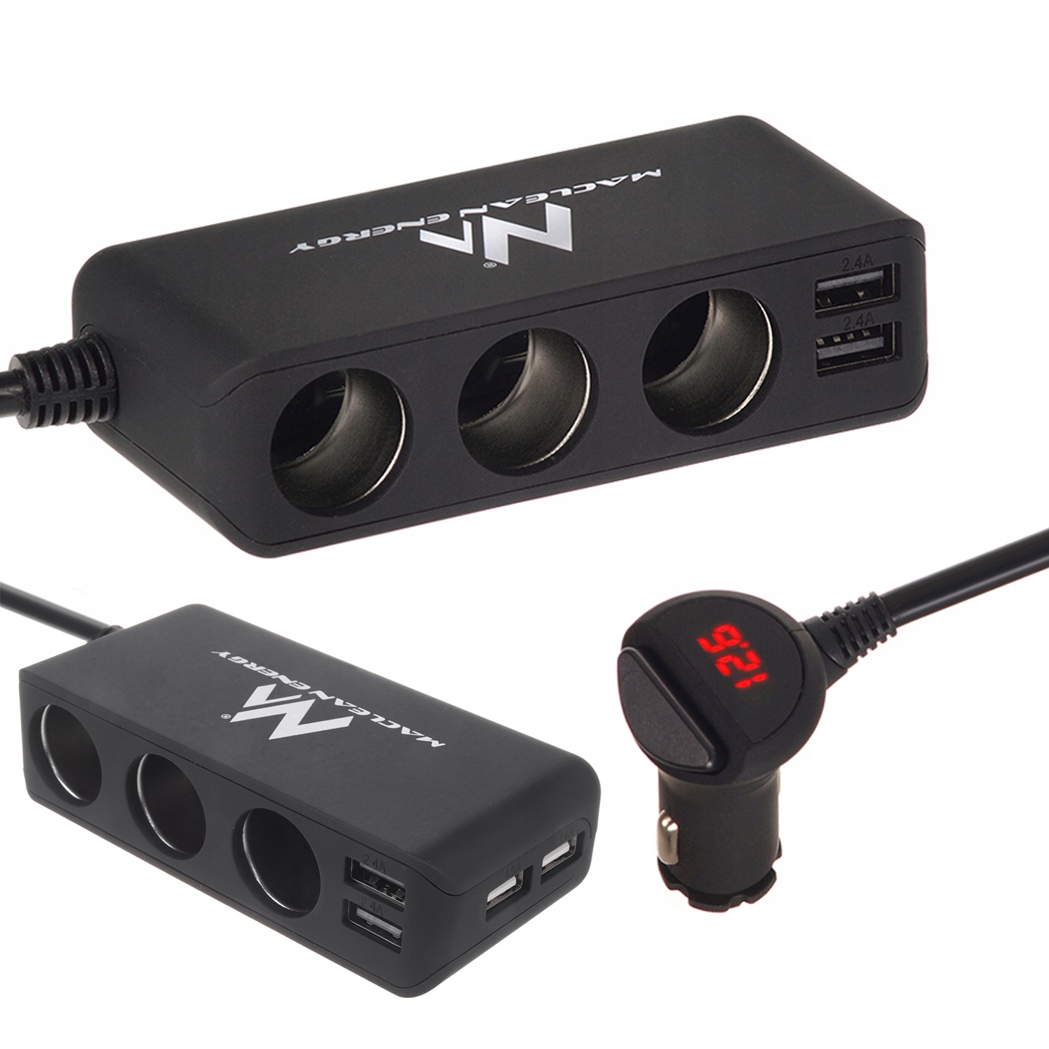 - Адаптер збільшує можливості нашого автомобільного прикурювача з 1 до 3 гнізд з двома додатковими портами USB з потужністю 2400 мА та двома з потужністю 1000 мА