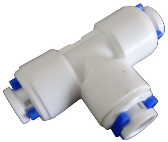 Т-подібний для підключення шланга діаметром 6 мм, це стандартний шланг, який використовується в усіх домашніх системах зворотного осмосу. Кріплення шланга за допомогою швидкороз'ємної муфти - ущільнення не потрібні. Шланг ущільнюється автоматично за допомогою ущільнювального кільця всередині фітинга.