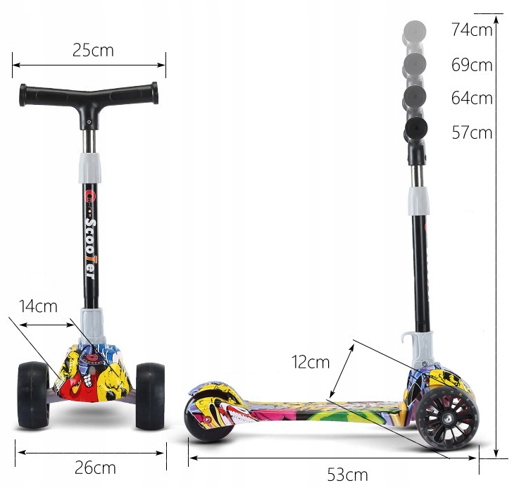 Регульована висота самоката дозволяє адаптувати його для користувачів різного віку та зросту. Наші самокати можна регулювати від 57 см до 72 см. Ця опція дозволяє використовувати самокат дітям зростом від 70 до 135 см.