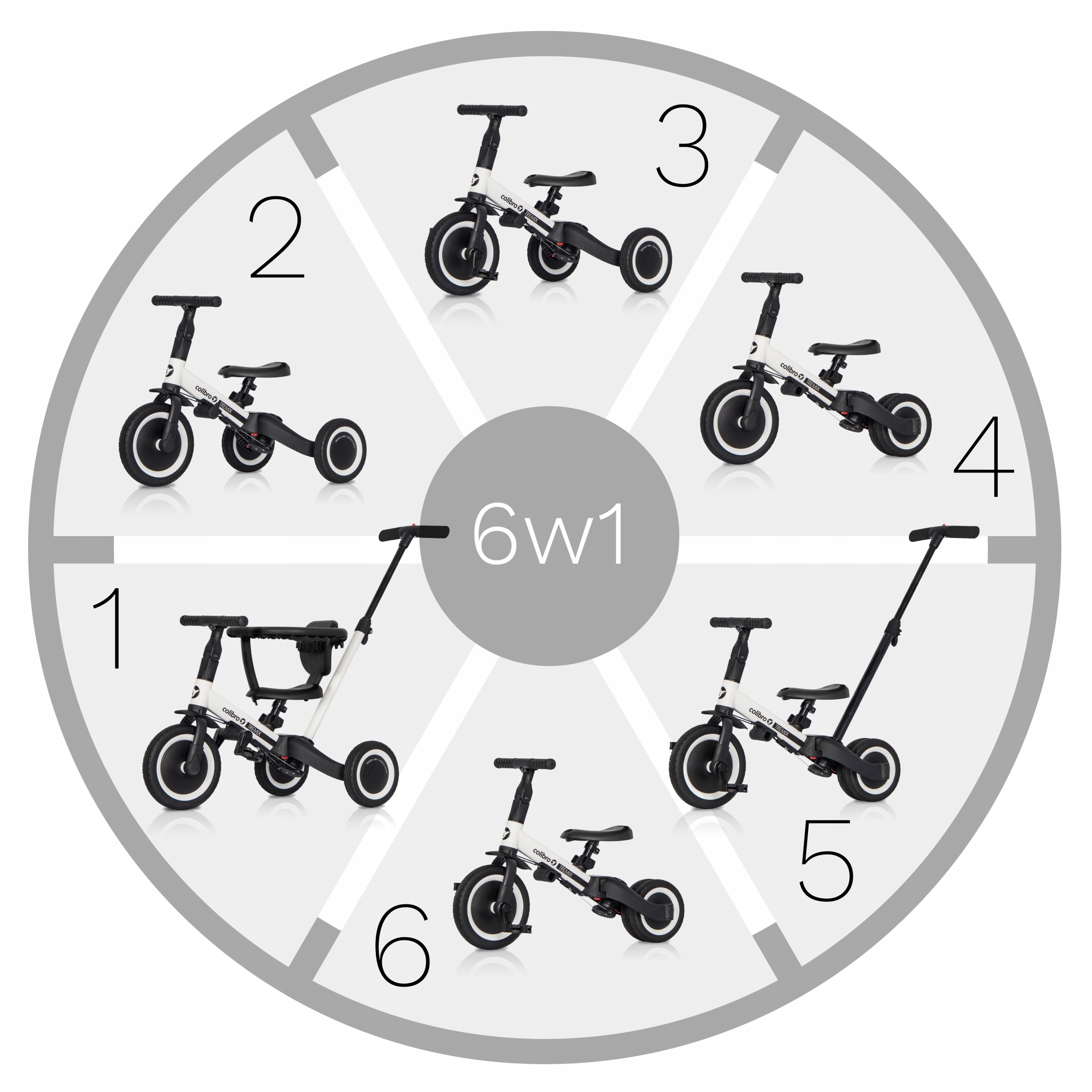 - Версії велосипеда: 6 в 1, коляска (від 1 до 2 років), триколісний велосипед (від 1 до 2 років дитини), триколісний велосипед (від 2 до 3 років), балансир (від 3 до 4 років), велосипед, двоколісний велосипед з штовхачем (від 4 до 5 років), велосипед двоколісний