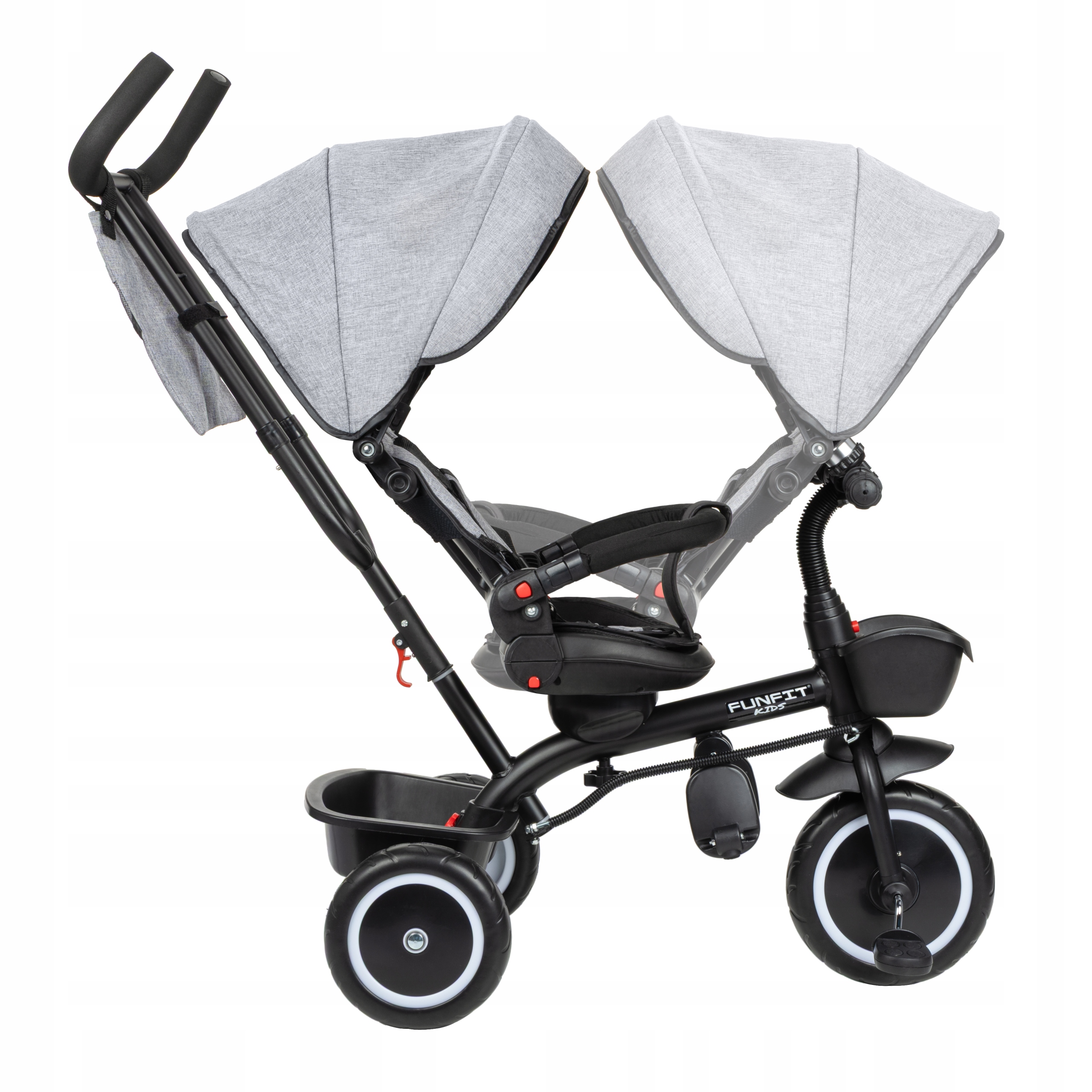 Триколісний велосипед FUNFIT KIDS - це ідеальне поєднання коляски та велосипеда в одному. Оснащений регульованою ручкою, він дозволяє батькам мати повний контроль над поїздкою дитини. Комфорт забезпечують м'яке поворотне сидіння з ременями безпеки та великий сонцезахисний навіс для захисту від сонця. Міцна конструкція гарантує стабільність і комфорт при їзді по різних поверхнях. Крім того, практичні кошики для аксесуарів дозволяють брати улюблені іграшки чи дрібнички на прогулянку.