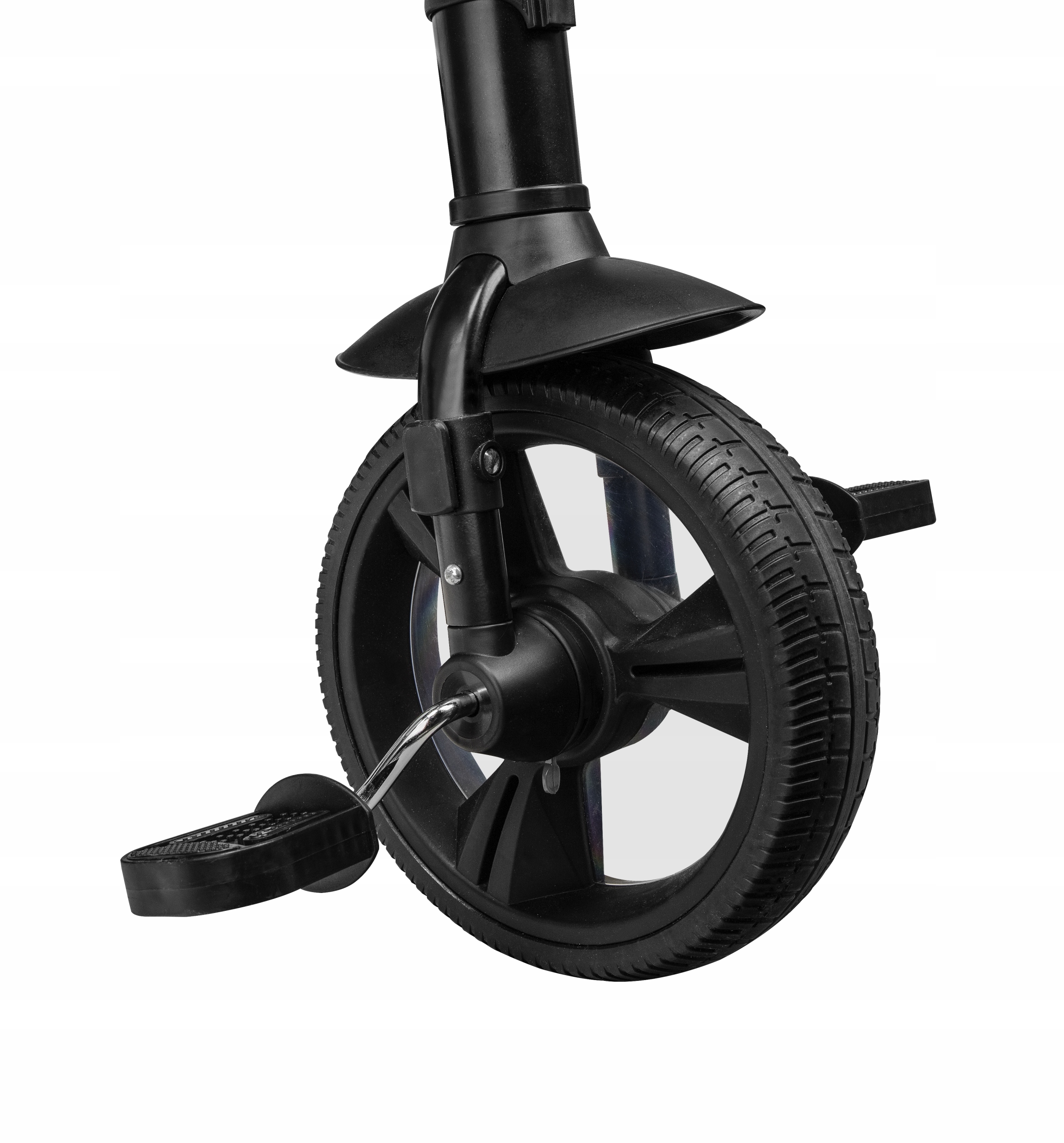 3 колеса великого діаметру 10" і 8" зі спеціально розробленим протектором дозвольте велосипеду вільно їздити по вибоїстих дорогах.Колеса виготовлені повністю з високоякісного, дуже легкого PU матеріалу - завдяки цьому їх неможливо пробити і вони не потребують накачуванняЄ також чохол на передньому колесі, яке піклується про ніжки дитини та виконує роль бризковика.