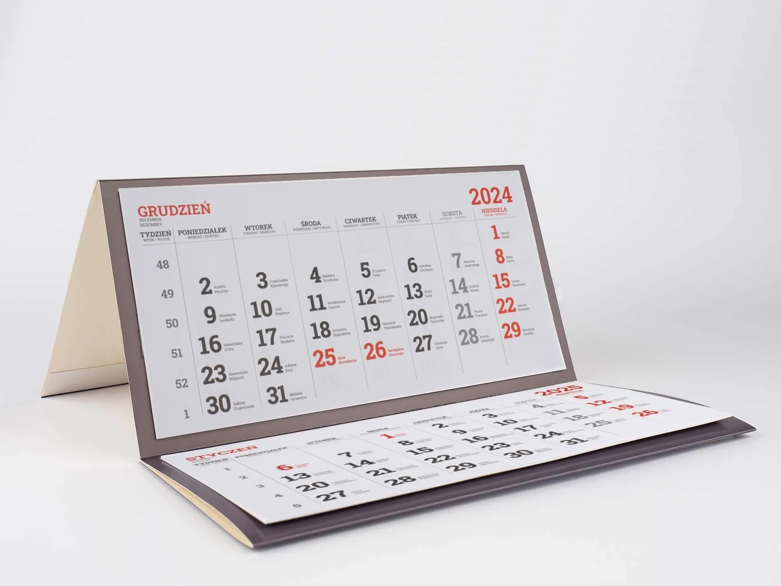 Стандартний календар - класичний настінний календар з трьома календарями та головою, на якій можна розмістити індивідуальний проект. Головка календаря надрукована повноколірно. До голови приклеєні спинки нейтрального сірого кольору. На звороті стандартно три календаря - на поточний місяць, а також на попередній і наступний, червоного і чорного кольорів. Ми можемо прикріпити корисні вікна до календарів, щоб вказати поточну дату. Віконця доступні в 6 кольорах, тож ви можете підібрати їх до календаря відповідно до ваших уподобань.