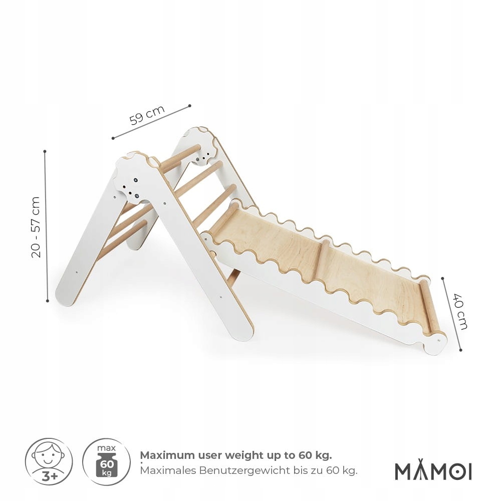 ✅ Опис товару: Торгова марка MAMOI виробляє унікальні товари та іграшки, присвячені найменшим діткам. \Наша пропозиція також включає сучасний трикутник для скелелазіння з гіркою-драбинкою, виготовлений з білої пряжі та фанери з ЧПУ. Решітки виготовлені з деревини бука. Даний продукт відповідає всім суворим європейським стандартам якості і є абсолютно безпечним для дітей. Крім того, він надзвичайно міцний. Завдяки його точному дизайну вантажопідйомність становить до 110 фунтів (50 кг). Набір призначений як для малюків від 36 місяців, так і для дітей старшого віку. Призначений для використання вдома та в саду. Скелелазіння дуже корисно для психомоторного розвитку дитини та покращує силу м'язів! Трикутник для лазання призначений для самостійного монтажу. Всі деталі з'єднані за допомогою плоских гайок Еріксон, безпечних для дитячих рук. Гірки для лазання можна комбінувати з додатковими ігровими килимками. Висота трикутника регулюється від 20 до 57 см. Гірка – це універсальний аксесуар, який можна використовувати як драбинку, так і гірку. Його форма дозволяє швидко з'єднати гірку з драбинкою або трапецією. Просто прикріпіть дошку на потрібній висоті за допомогою попередньо просвердлених отворів. Продукт готовий до використання відразу з коробки. Також відомий як: дерев'яний ігровий зал, трикутник з гіркою, дитячі драбини та ігрові конструкції, трикутник для лазіння, іграшки Монтессорі, скелелази для дітей на відкритому повітрі, рами для лазіння для дітей віком від 1 до 3 років, дерев'яні скелелази для приміщень, відкриті драбини для дітей , лазалки.✅Технічні дані:
