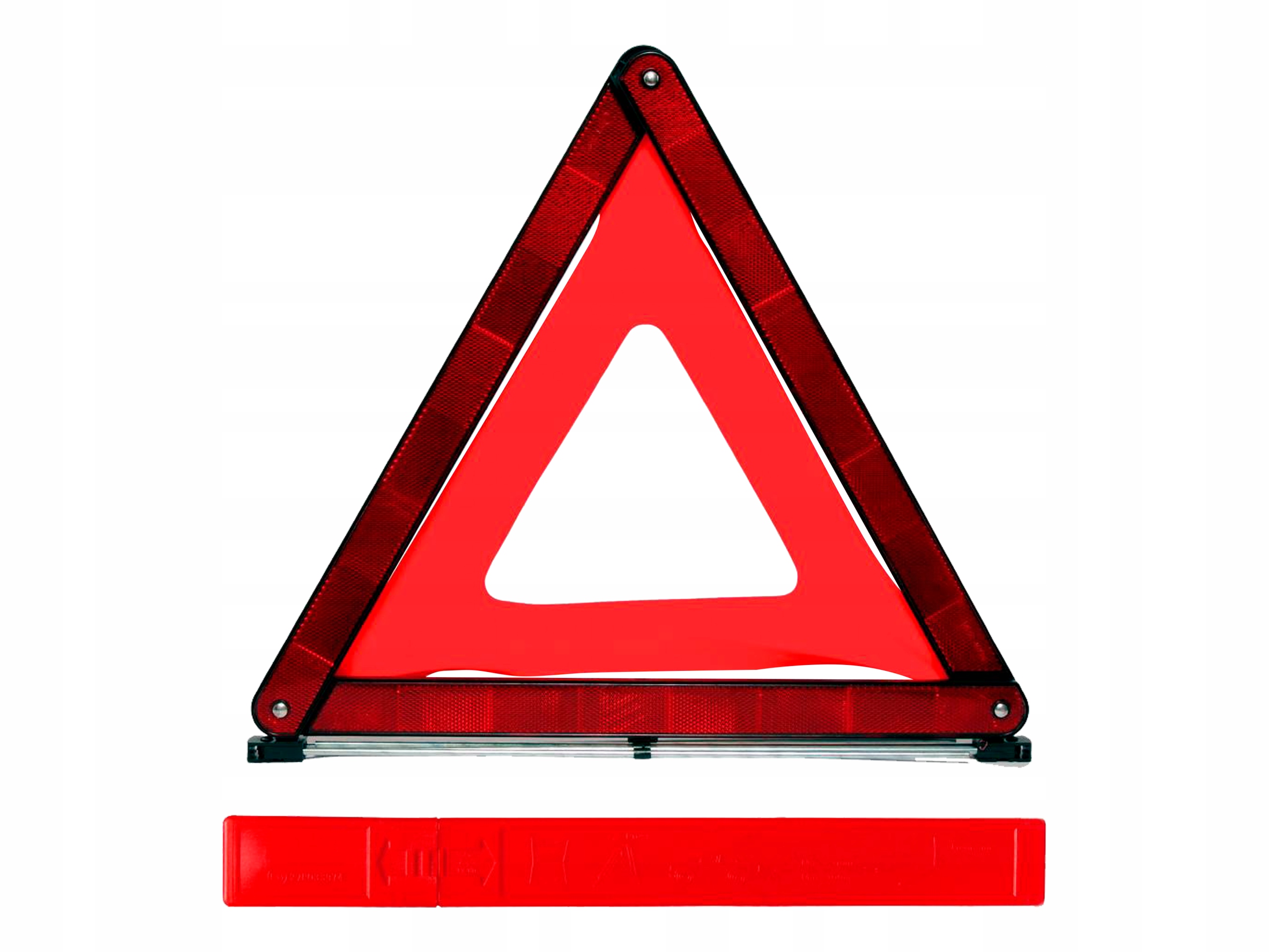 Червоний трикутник, має світловідбиваючі елементи. Надзвичайно простий у використанні, швидко та легко розкладається та складається. Крім того, має практичну підставку складається з чотирьох опор,що забезпечує йомустійкість і гарну видимість після розгортання. Додатково в комплект входить пластиковий футляр для зберігання в багажнику.