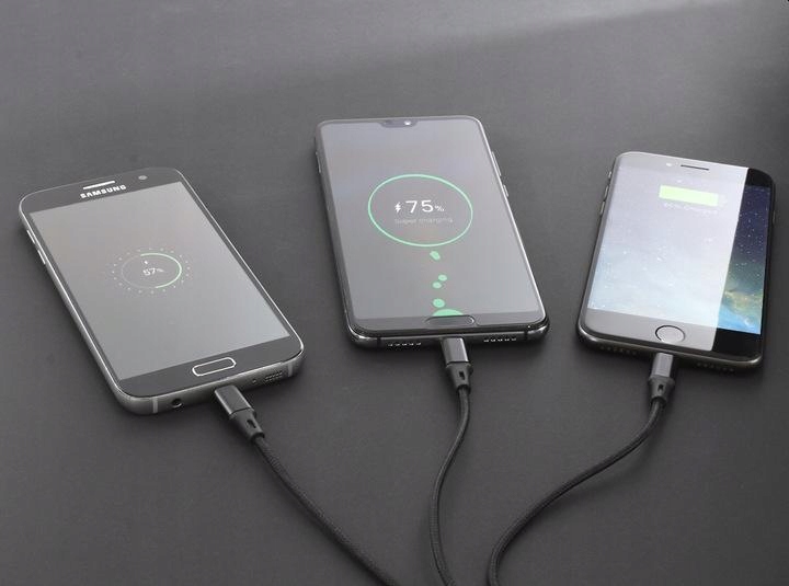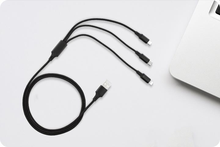 Міцний нейлоновий USB-кабель із опліткою з трьома різними типами роз’ємів.