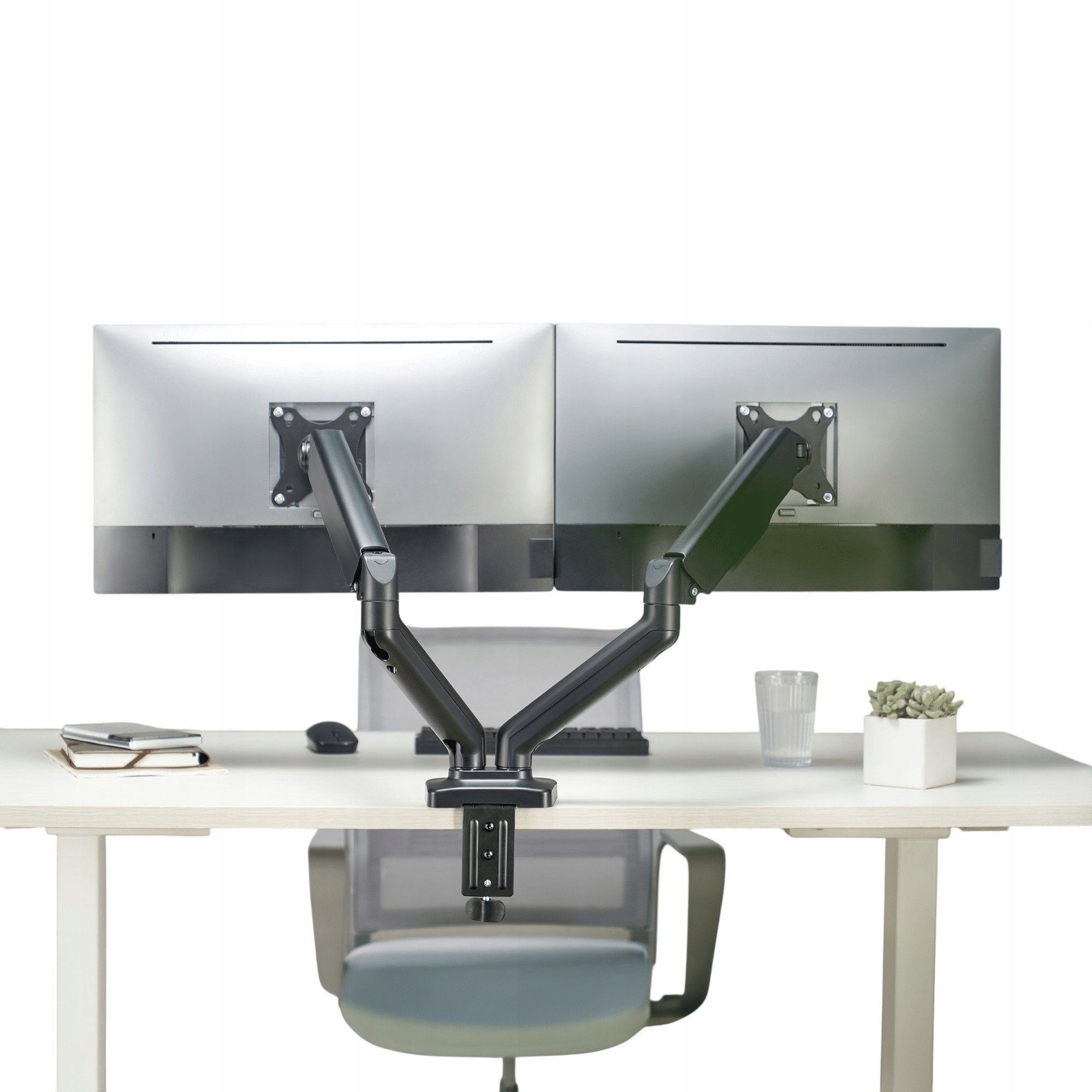 Практичний тримач дозволяє встановити два монітори поруч, оптимізуючи простір на столі. Завдяки регульованим рукояткам ви можете легко змінювати висоту, нахил і обертання екранів і налаштувати їх положення для більш комфортної роботи. Тримач підходить для моніторів 17-32" із кріпленням VESA та пропонує стабільну конструкцію з можливістю встановлення на краю столу або за допомогою втулки. Тримач належним чином і надійно прикріплений до стільниці чи стіни відповідно до специфікацій виробника. Максимальна вантажопідйомність і розмір моніторів, рекомендовані виробником, не повинні перевищуватись. Регулярно перевіряйте затягування гвинтів і кріплення тримач, особливо після першого розміщення моніторів, слід проводити на стійкій поверхні, недоступній для дітей. Не використовуйте тримач, якщо будь-яка його частина пошкоджена або деформована