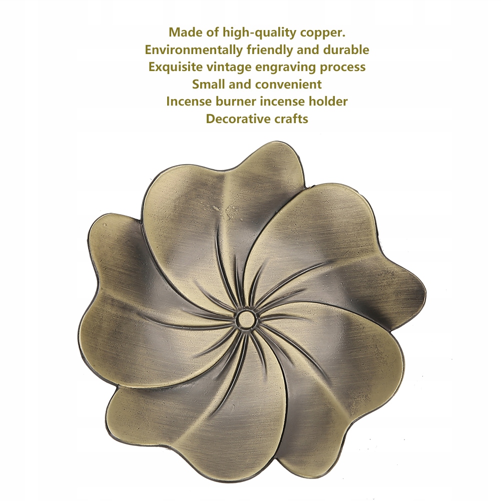 1. Виготовлений з високоякісної міді, тримач для пахощів екологічно чистий і довговічний у використанні. 2. Завдяки вишуканому вінтажному процесу гравіювання така мідна пластина невелика та зручна, що є практичним. 3. Домашній декор можна використовувати як підставку для пахощів або декоративні вироби. 4. Тримач ароматичних паличок підтримує гарантовану якість, тому ви можете впевнено використовувати його в житті. 5. Завдяки вишуканій майстерності цей тримач для пахощів можна легко використовувати в практичному житті, завдяки чому він набуває великої популярності.