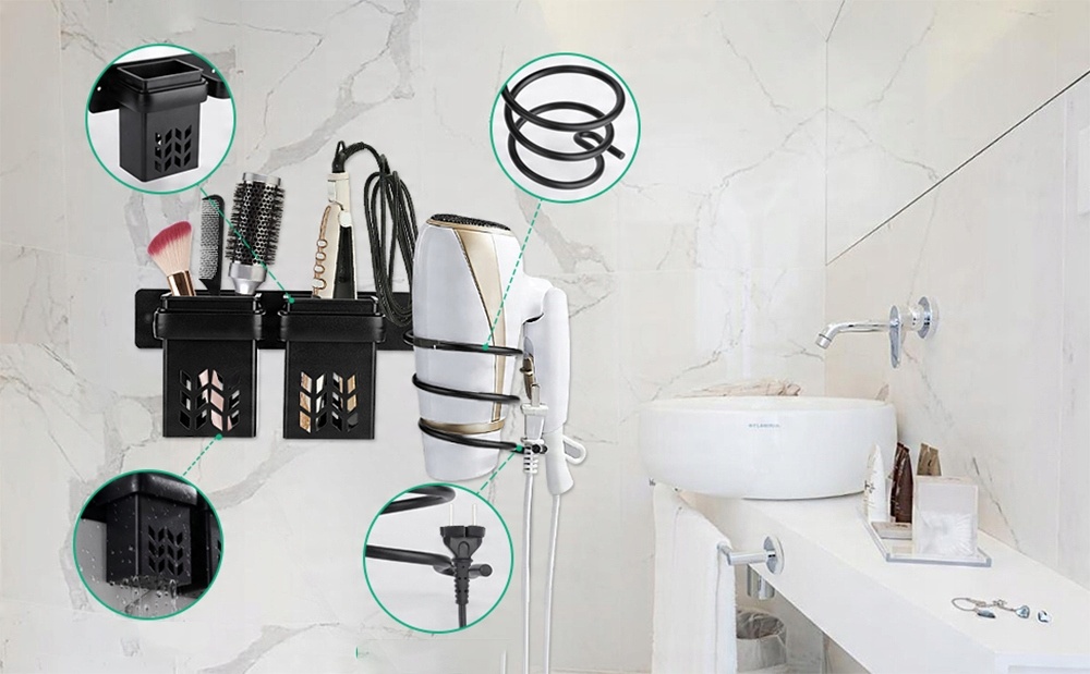 - У цьому настінному тримачі для фена можна розмістити майже всі інструменти для догляду за волоссям, наприклад фени випрямлячі для волосся, бігуді, щітки для волосся, бритви тощо.