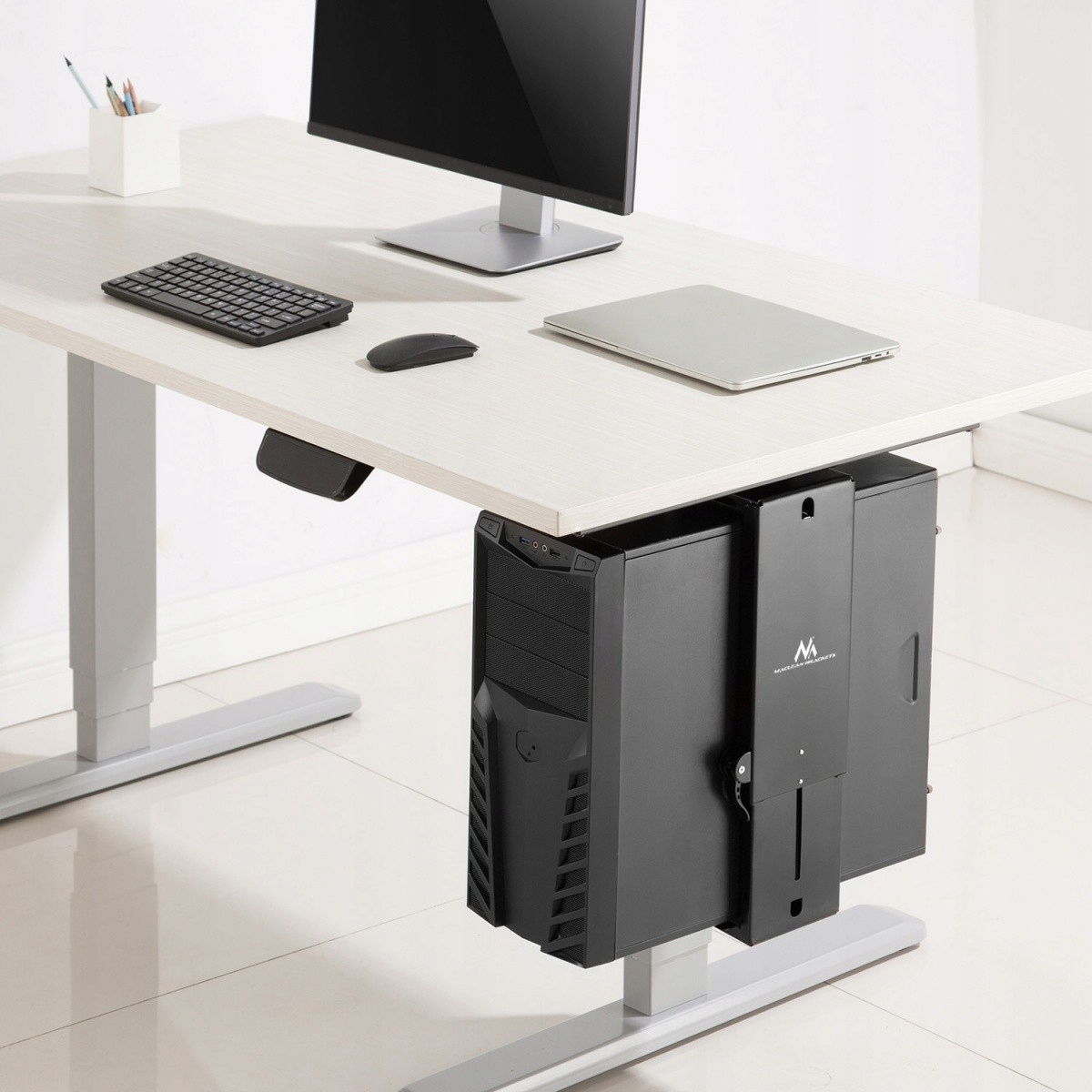 Кріплення MC-885 призначене для вертикального кріплення комп’ютера під столом. Це ідеальне рішення для оптимального використання робочого простору. Використання тримача MC-885 збільшує вільний простір на столі і в той же час утримує комп'ютер над підлогою, подалі від ніг, пилу і статичної електрики. Найголовніше, комп’ютер як і раніше у вас під рукою. Завдяки регулюванню висоти і ширини тримач можна адаптувати до більшості стандартних комп'ютерних корпусів. Крім того, конструкція тримача дозволяє повертати встановлений комп’ютер на 180°, що полегшує доступ до роз’ємів і кабелів на задній частині корпусу.