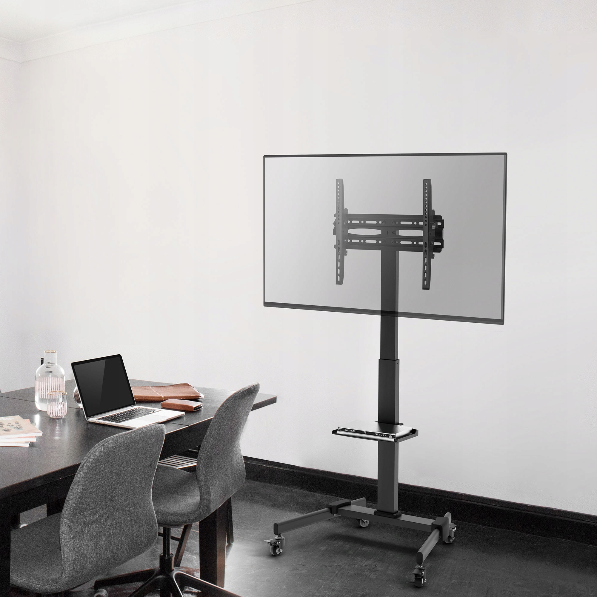 Тримач оснащений полицею з максимальним навантаженням 5 кг, яку можна відрегулювати на відповідну висоту. Ідеально підходить для аудіо-відео обладнання, приставок або ігрових консолей.