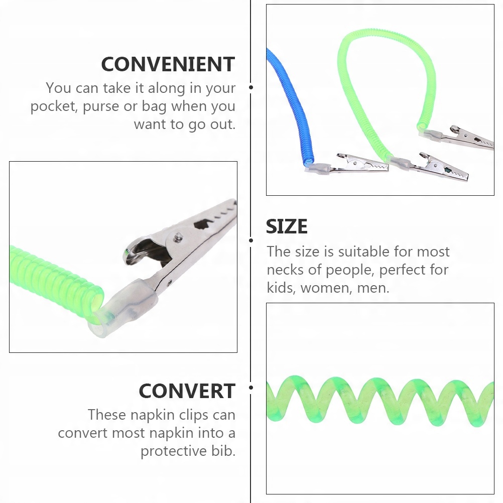 Ці затискачі для серветок можуть перетворити більшість серветок на захисний нагрудник і захистити ваш одяг від плям, спричинених жиром, соусом та іншими харчовими забрудненнями.