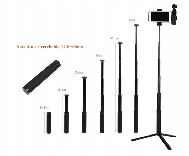 - Монопод - подовжувач з регулюванням висоти від 14,8 см до 66 см, що дозволяє для високого штатива та монопода - палиця для селфі