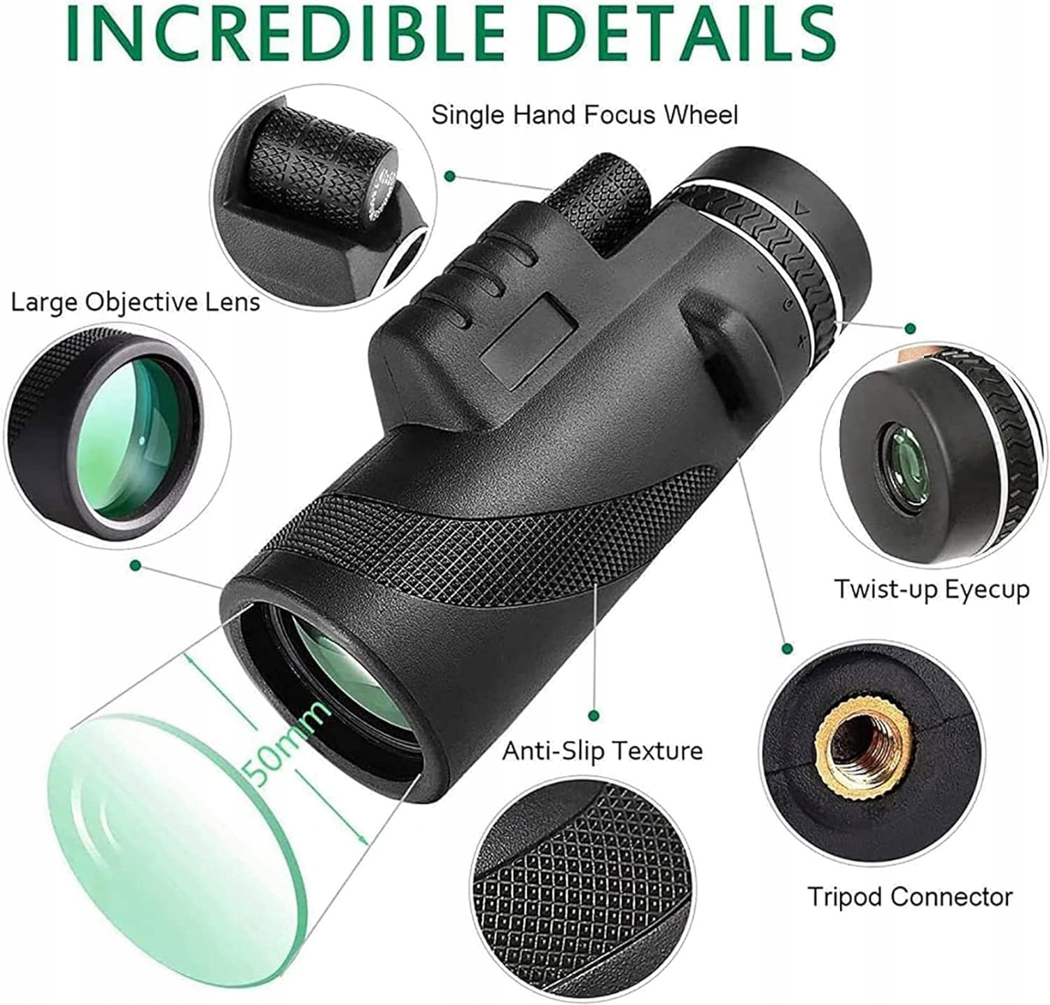 Багатошарове покриття лінз покращує ключові функції монокуляра, забезпечує добре пропускання світла та яскравість, а також робить видимість чіткішою. Цей бінокль є універсальним і підходить для різноманітних заходів на свіжому повітрі, включаючи спостереження за дикою природою, спортивні події та спостереження за нічним небом.