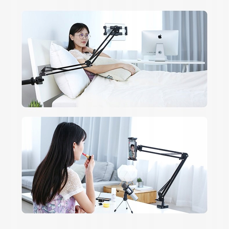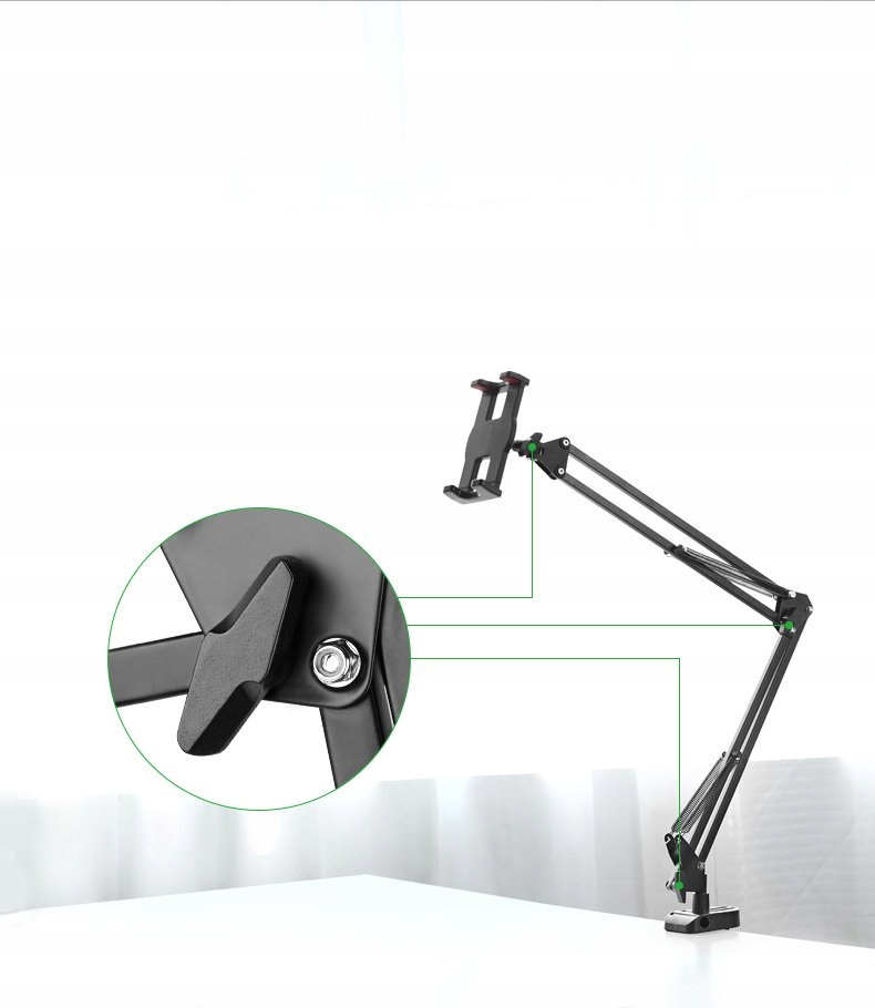 Помістивши телефон або планшет у тримач, ви можете вільно регулювати кут, під яким ви можете дивитися на екран. Пристрій дозволяє 2-ступінчасте регулювання в діапазоні до 360 градусів, що робить установку відповідної відстані від користувача дуже легкою. Довжина кронштейна з алюмінієвого сплаву становить 65 см, що дає багато можливостей регулювання.