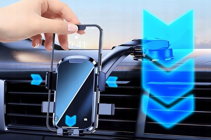 Стисніть бічні кнопки, щоб відкрити щелепи. Вставте телефон і обережно натисніть на підставку. Вага телефону розблокує механізм, а губки тримача автоматично затиснуть телефон!