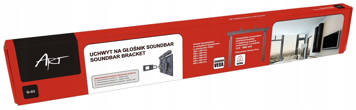 Тримач динаміка SOUNDBAR із проміжком монтажних отворів у діапазоні 115–680 мм. Кріплення сумісне з усіма телевізорами зі стандартом VESA 200X200, 300X200,300X300, 400X300, 400X400,500X400, 600X400 і розміром монтажних отворів у діапазоні 115-680 мм. Максимальна вантажопідйомність ручки - 10 кг.